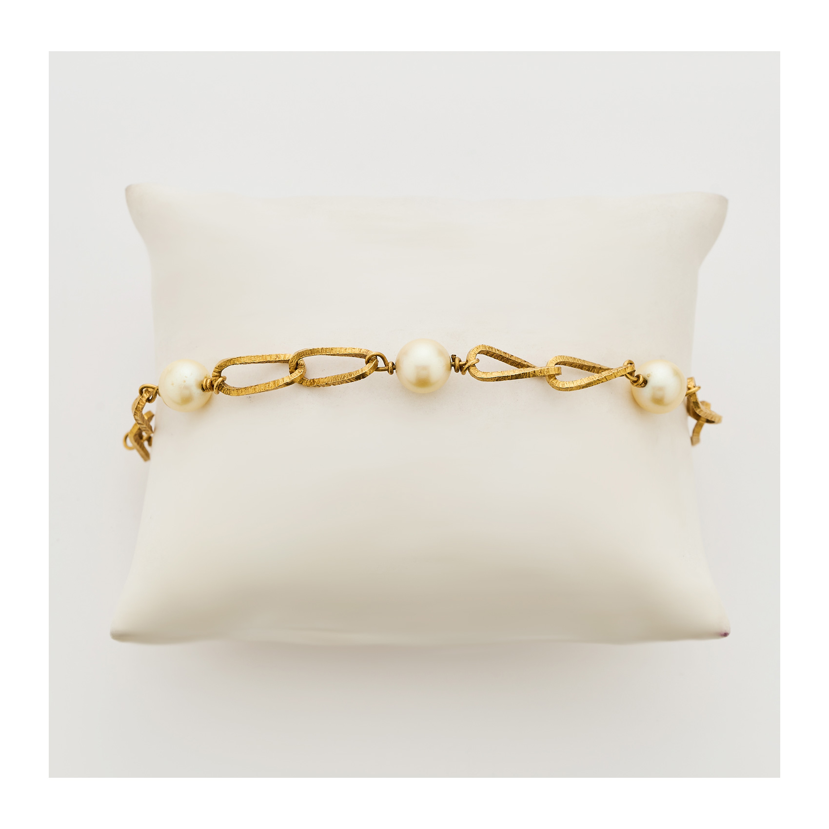 Pulsera en oro mate con pareja de eslabones y perlas cultivadas de 8 mm. alternados.