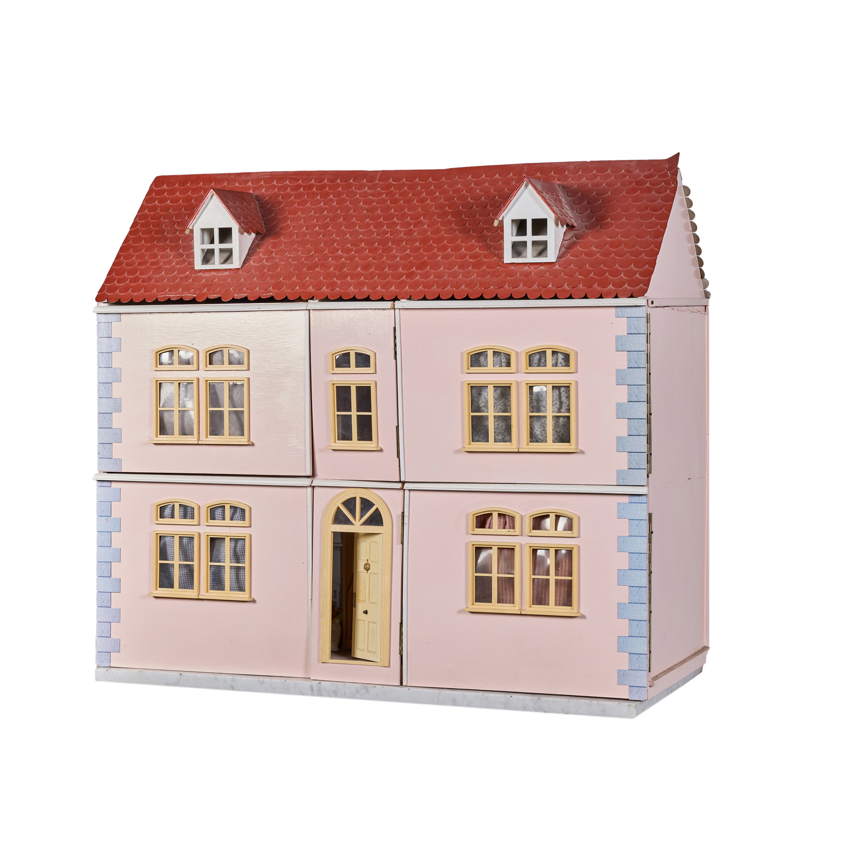 Casa de muñecas en madera policromada, s.XX. Distribuida en dos pisos y buhardilla. Incluye varios muebles y acessorios. Electrificada.