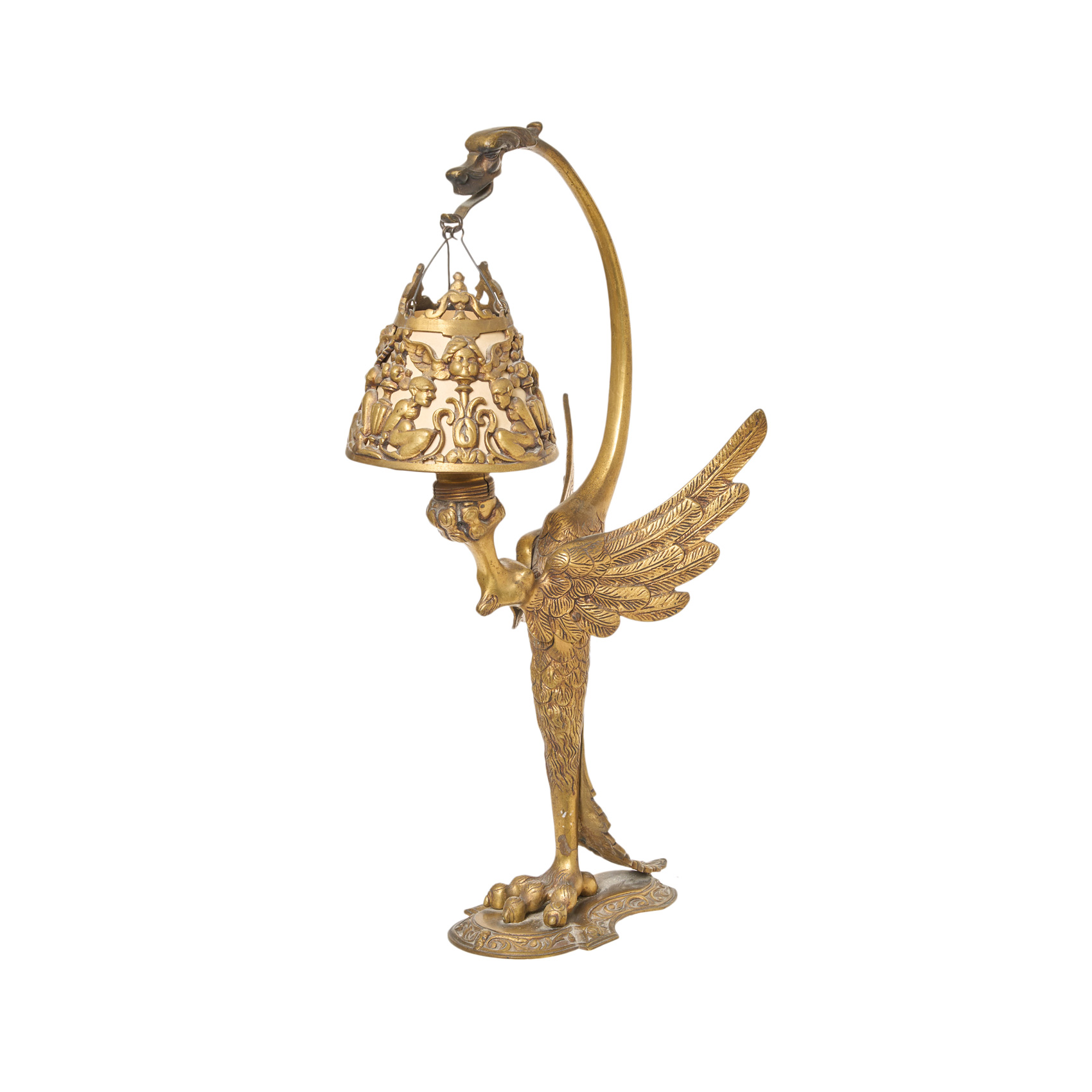 Lámpara de despacho en bronce dorado con fuste en forma de figura alada y pantalla colgante con decoración grutesca, s.XX.