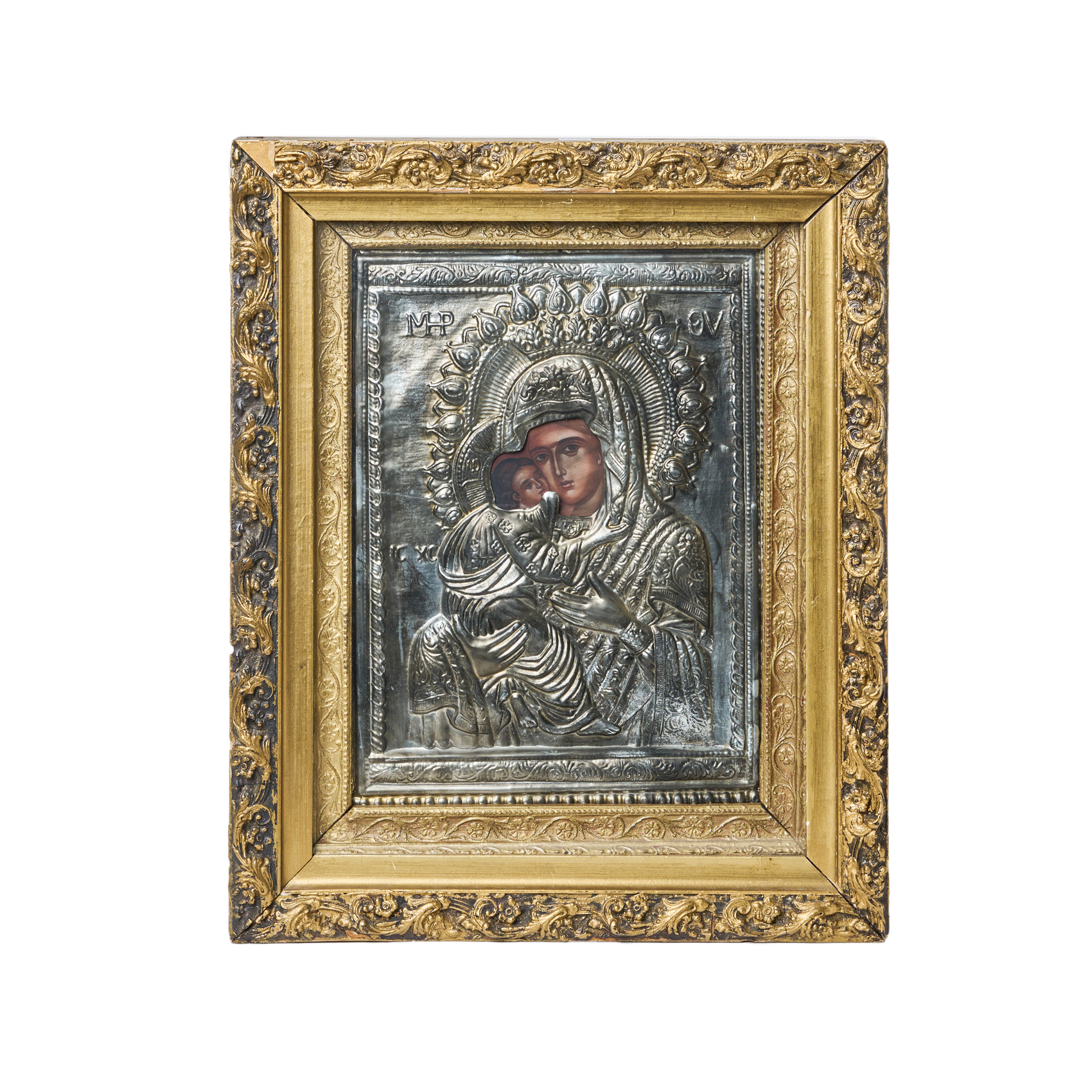 Icono ruso pintado al temple sobre tabla con representación de la Virgen con el Niño con rizza en metal plateado y repujado, fles. del s.XIX. Enmarcado.