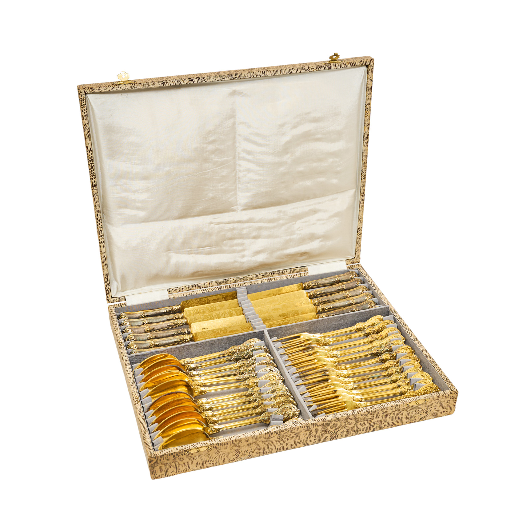 Lote de 36 piezas de cubertería francesa en metal plateado vermeil, s.XX. Compuesto por doce tenedores de mesa, doce cucharas soperas y doce cuchillos. Adjunta estuche.