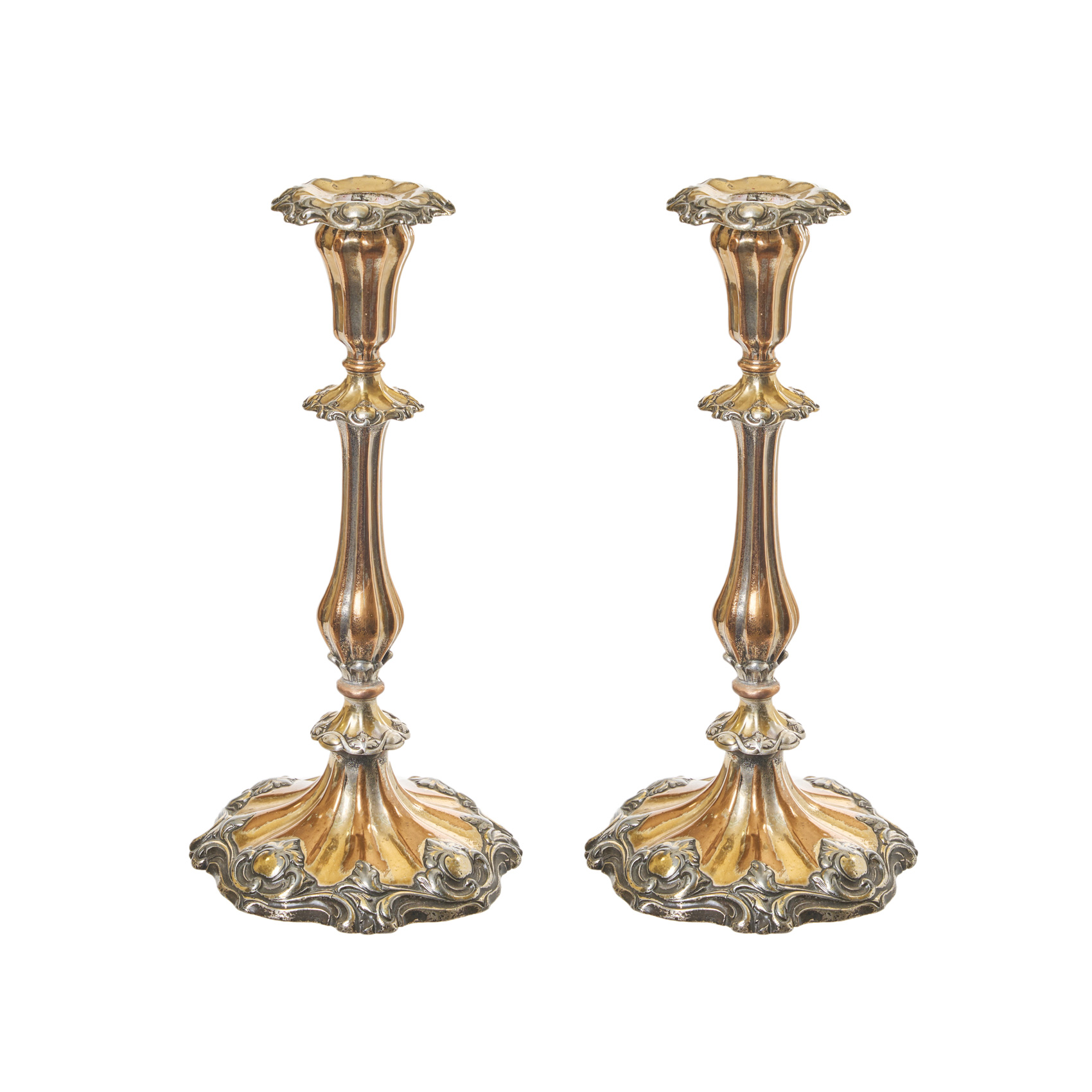Pareja de candeleros ingleses en metal plateado con ligeras pátinas en dorado y cobre con decoraciones fitomorfas, de roleos y acantos, mediados del s.XIX.