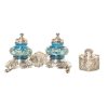 Lote de botella y escribania en plata, mediados del s.XX. Botella en plata española punzonada con decoraciones florales y de puttis en relieve. Escribania punzonada 800 con decoraciones repujadas de rocallas, mediados del s.XX. Tinteros en cristal de tonalidad azul con decoraciones florales pintadas. Escribania: 11 x 17 x 13 cm. Tapa y tintero presentan faltas. Botella: 12 x 10,5 x 6 cm. Peso plata: 307,5 gr. Estimación: 350 – 450 €.