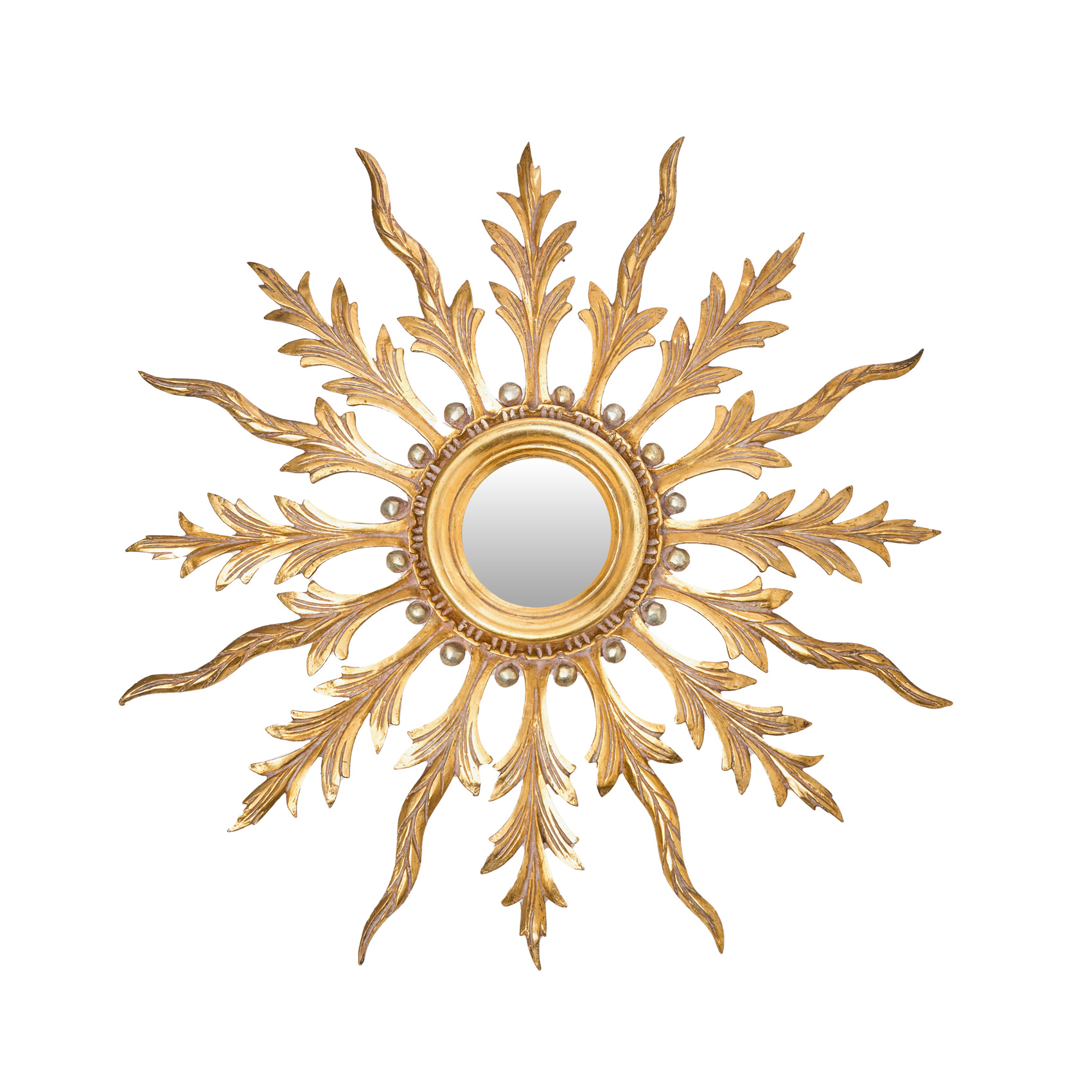 Espejo en forma de sol en madera tallada y dorada con ráfagas de motivos vegetales y centro con moldura de esferas perladas, s.XX.