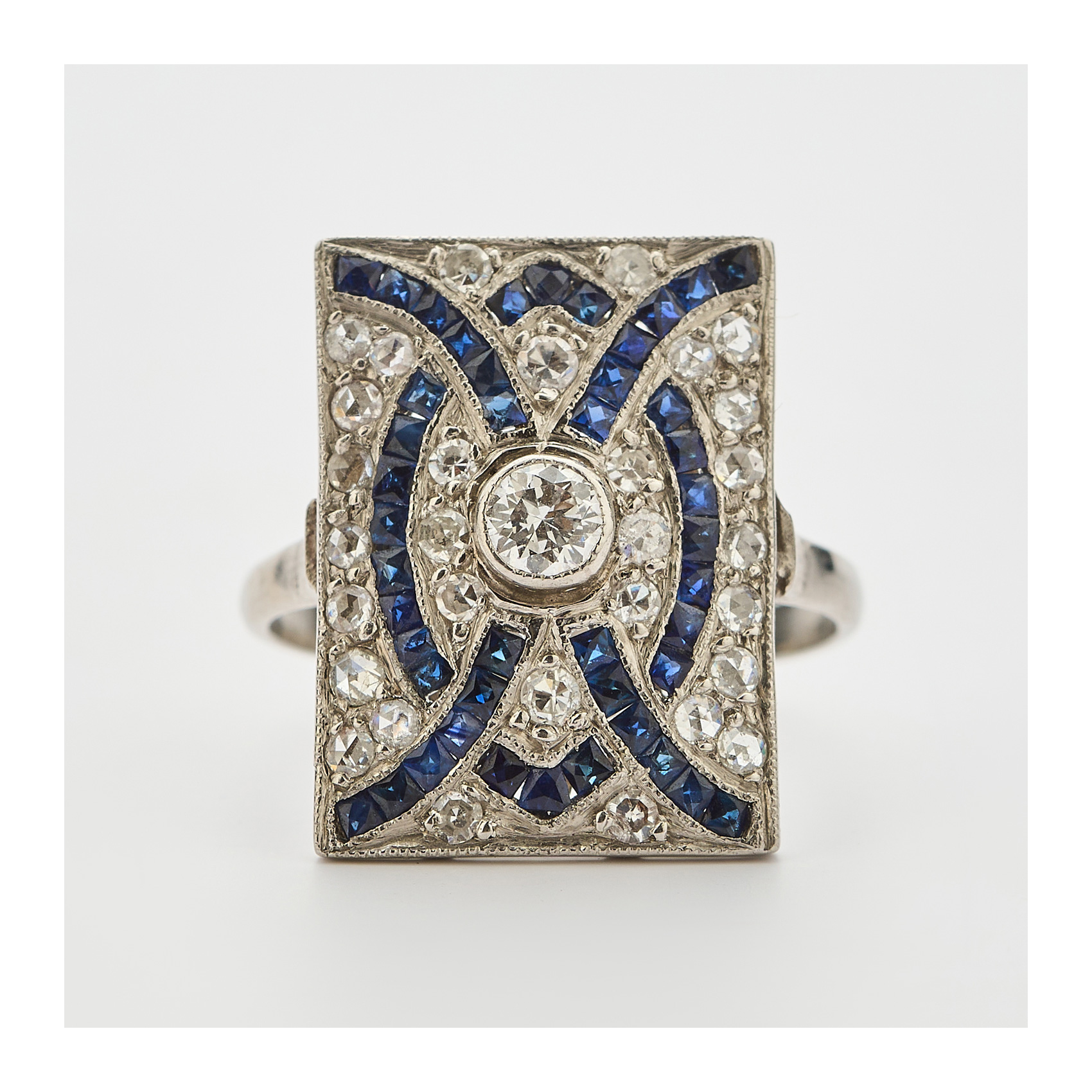 Sortija diseño rectangular estilo Art Deco en platino, diamantes tallas brillante antigua y rosa holandesa y zafiros azules calibrados.