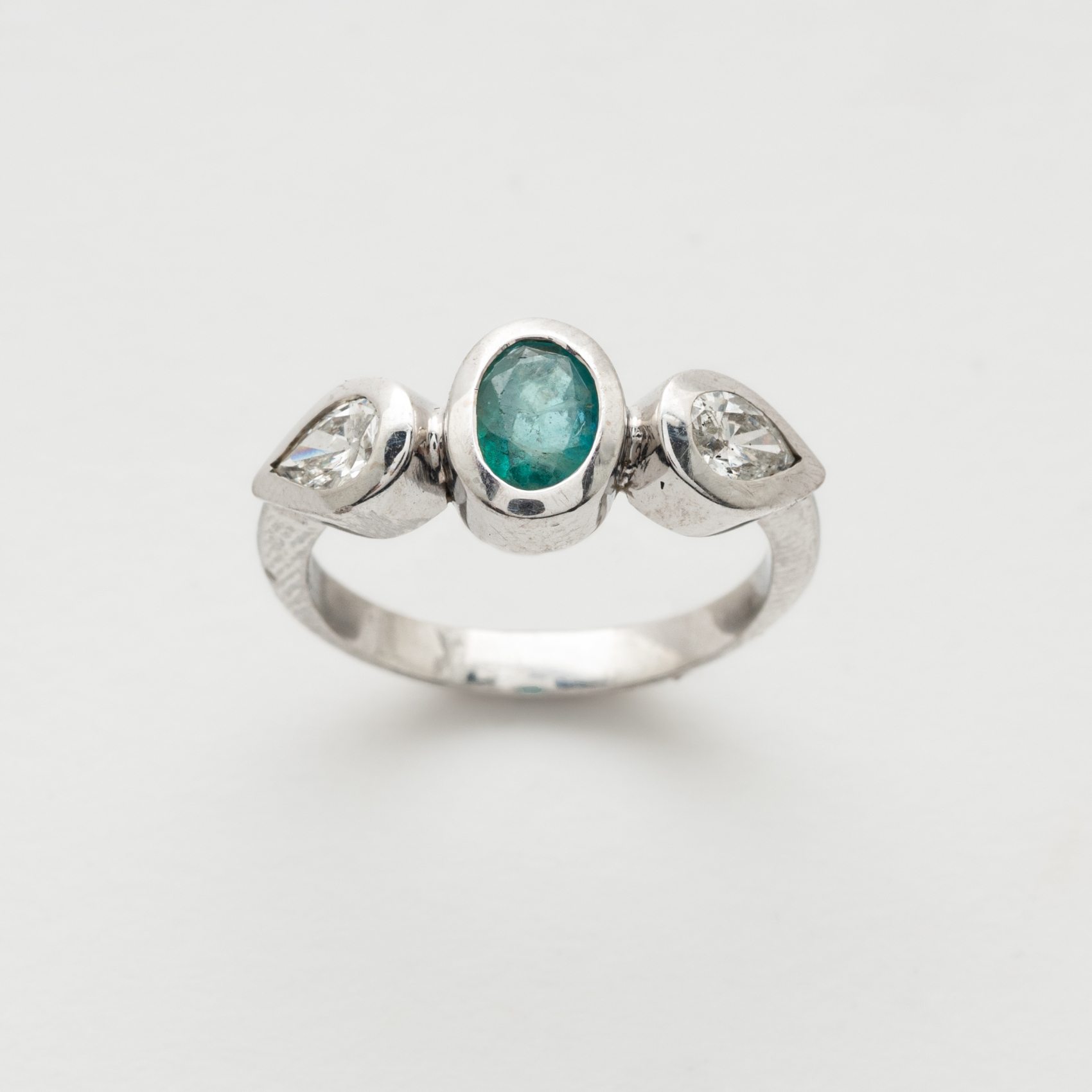 Sortija en oro blanco tipo trilogía con esmeralda central talla oval en chatón y dos diamantes talla pera.