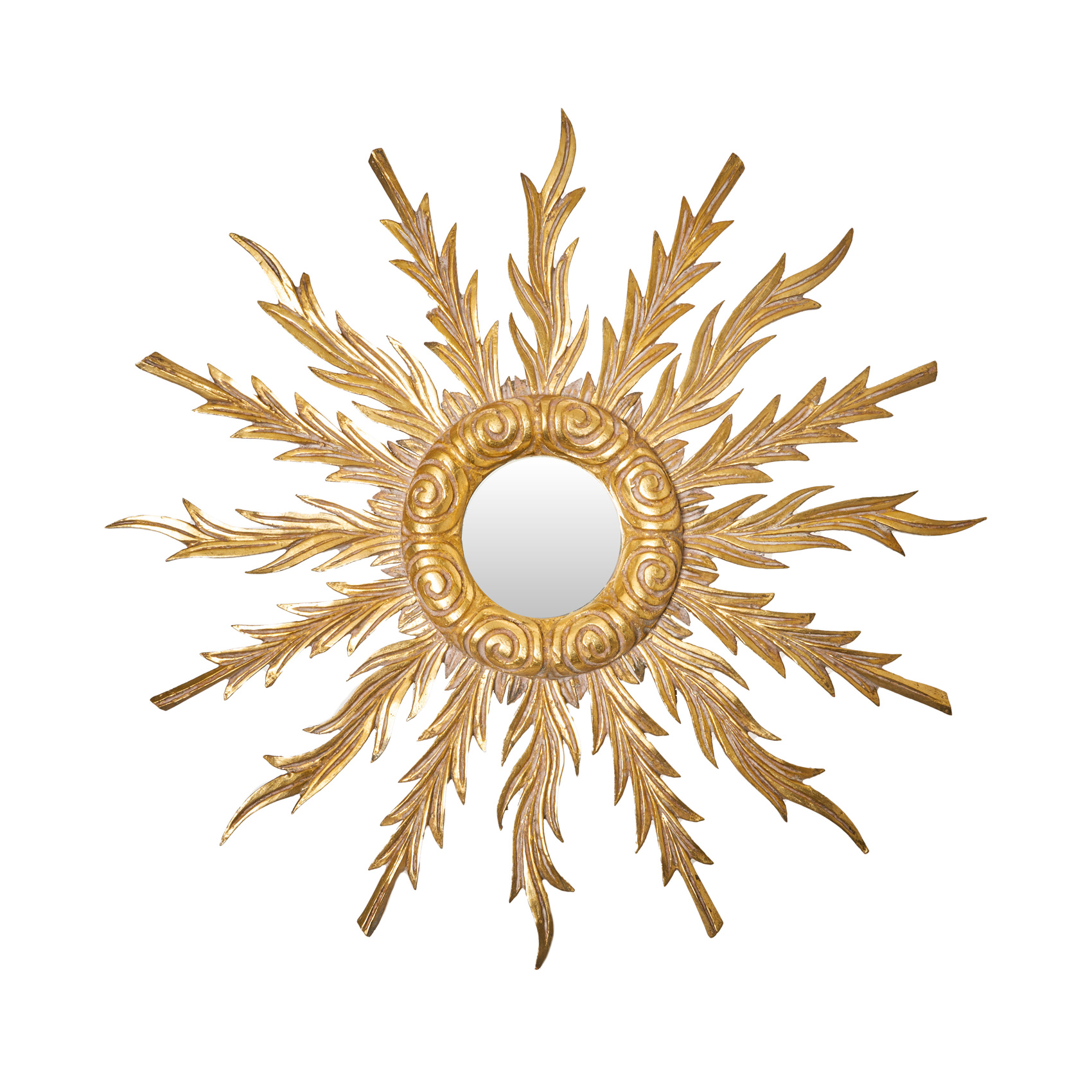 Espejo en forma de sol en madera tallada y dorada con ráfagas de motivos vegetales y centro con moldura geométrica, s.XX.