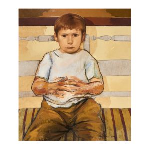 Pareja de sillones modelo «Armchair H-269» en madera de haya y tapicería geométrica en color crema. Segunda generación.