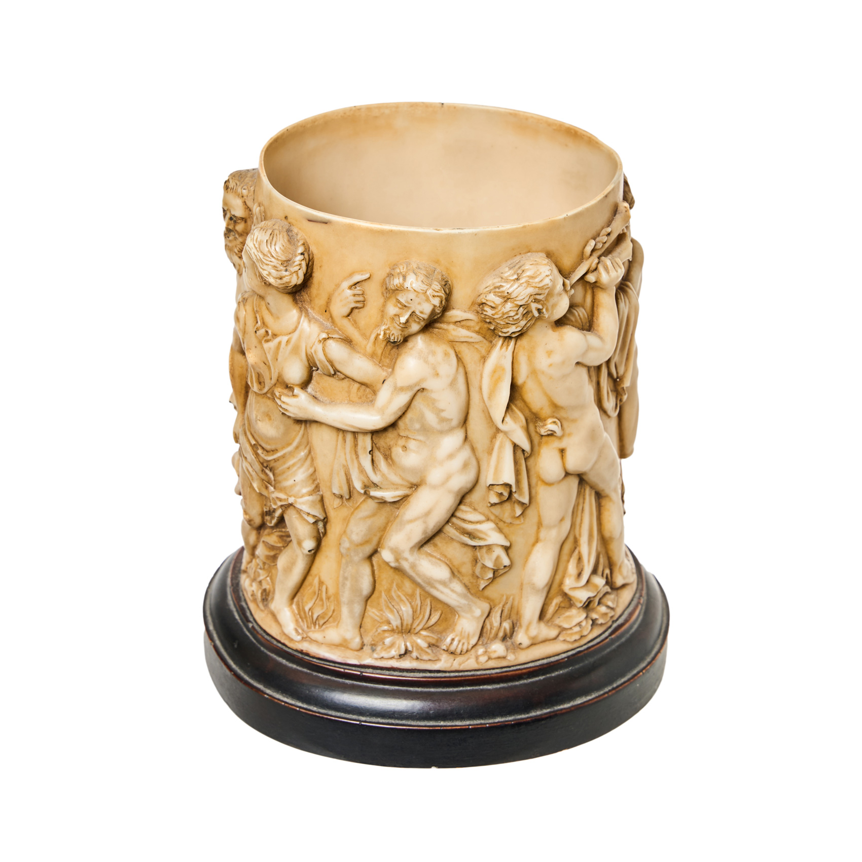 Cilindro de jarra estilo neoclásico en símil hueso con escena de bacanal en relieve, ppios. del s.XX. Sobre base en madera.