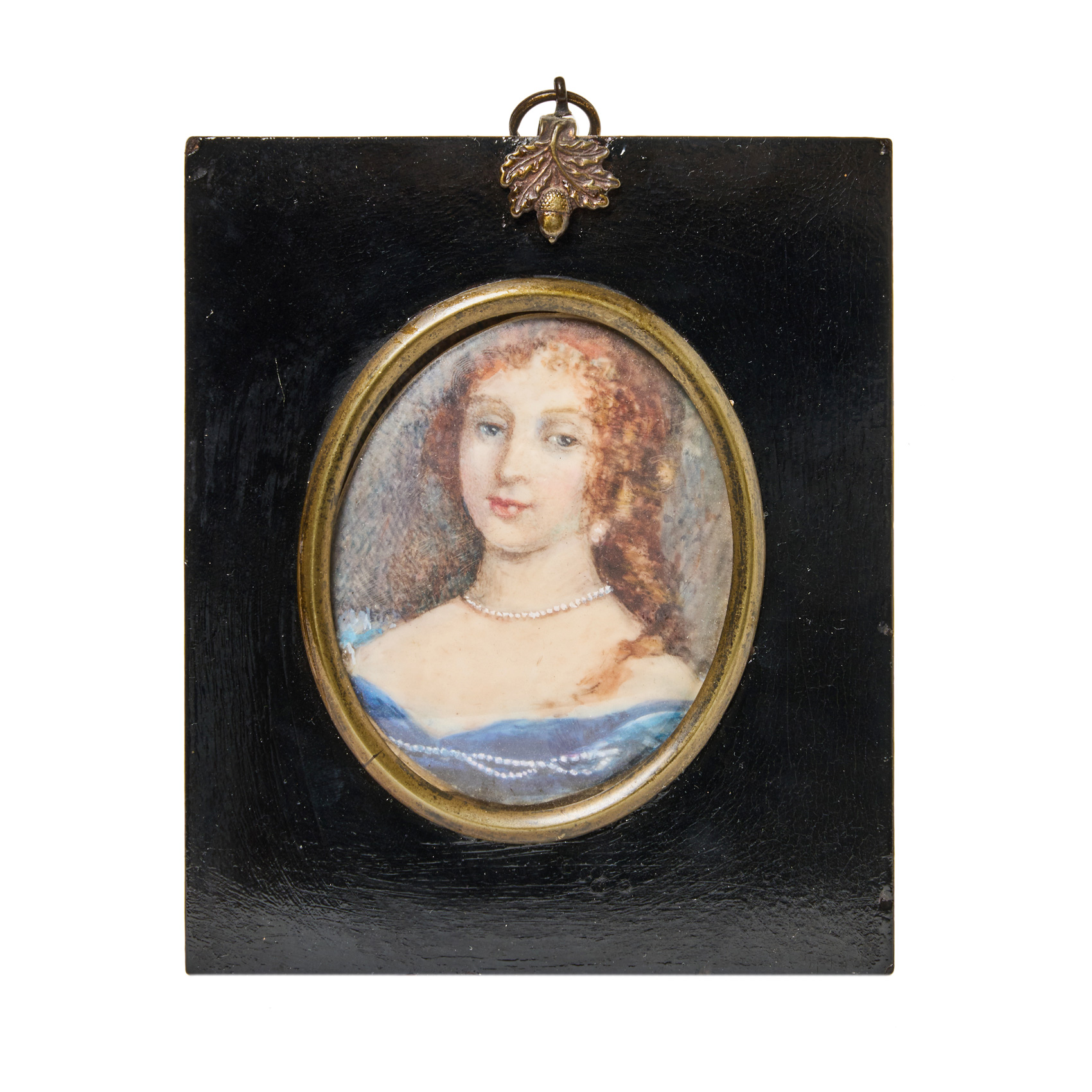 Miniatura pintada al gouache sobre placa en hueso con representación de dama con perlas, s.XX. Enmarcada.