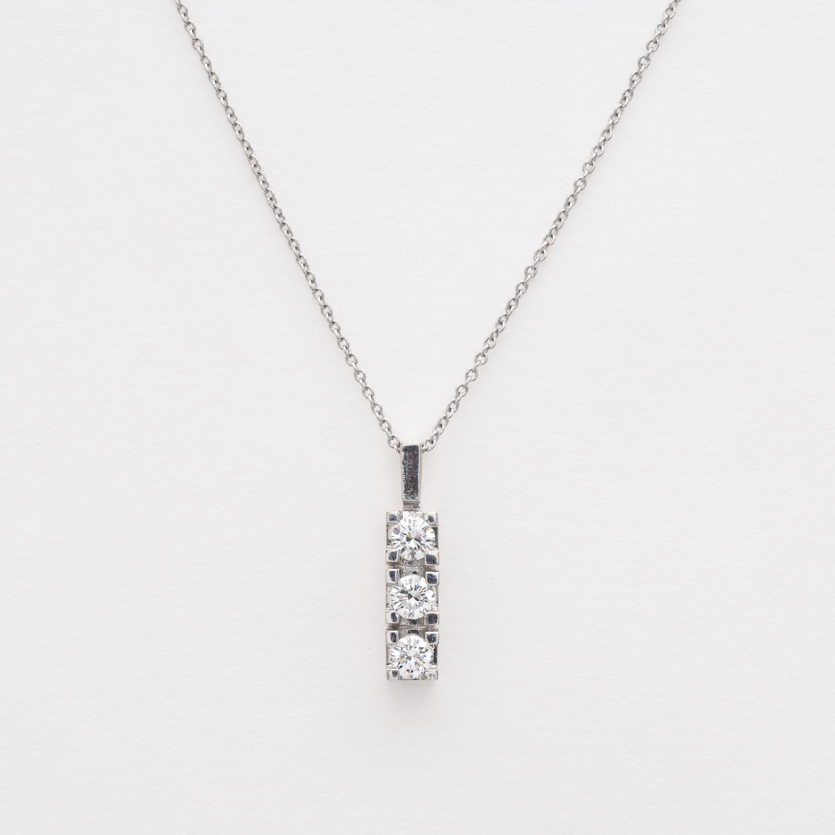 Gargantilla en oro blanco con tres diamantes talla brillante engastados en garras.