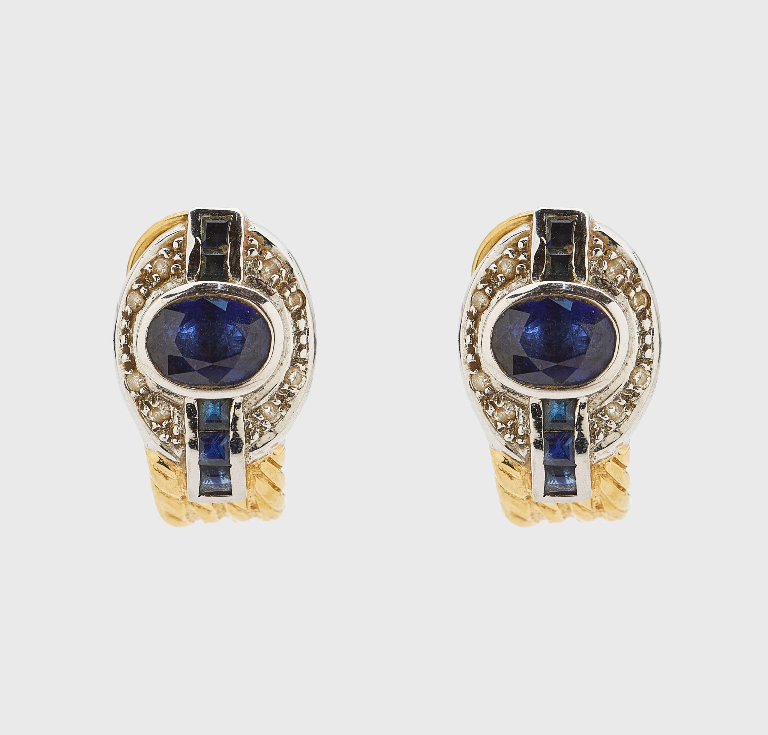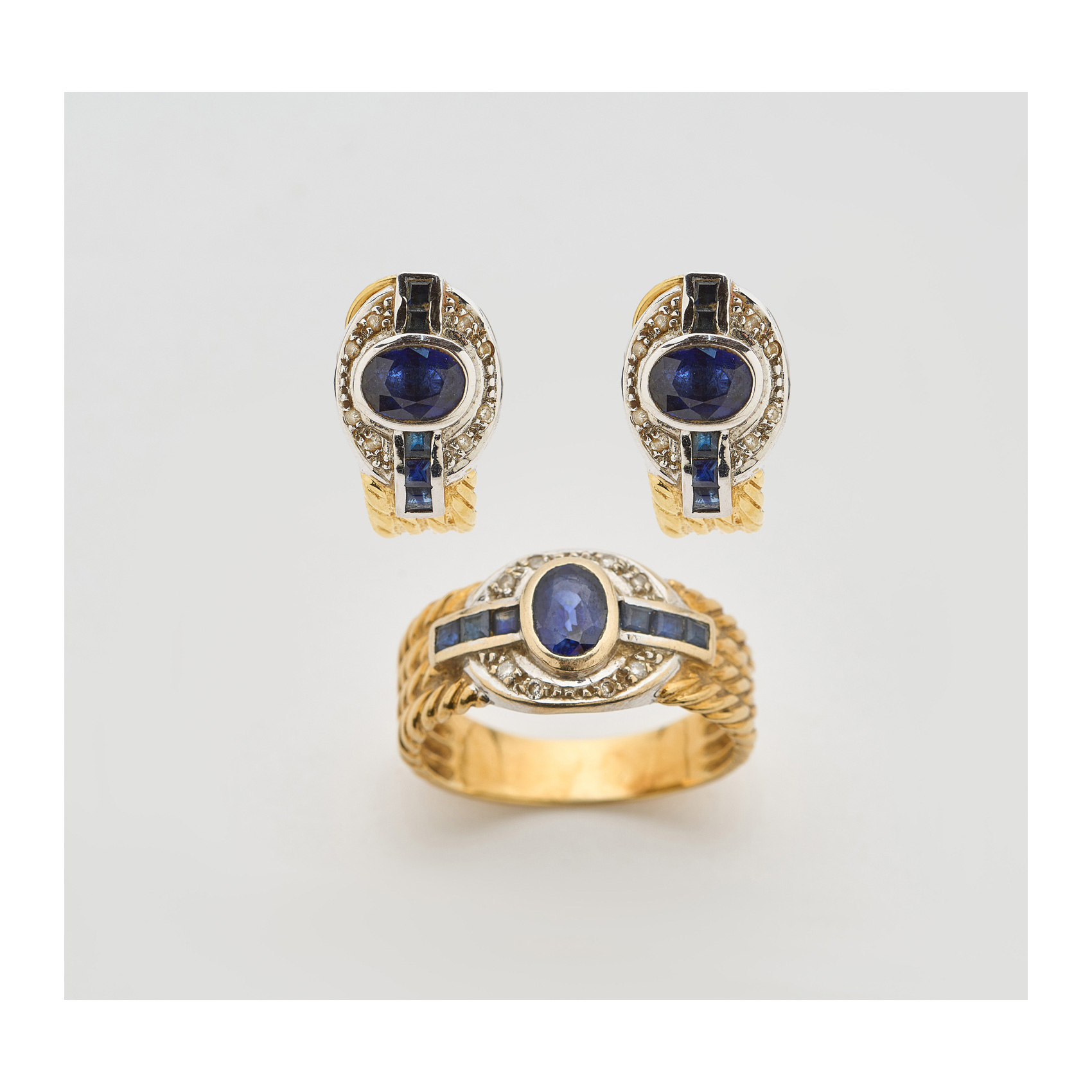 Juego de pendientes y sortija en oro bicolor con decoración de cordoncillo, diamantes talla brillante y zafiros azules tallas oval y carré.