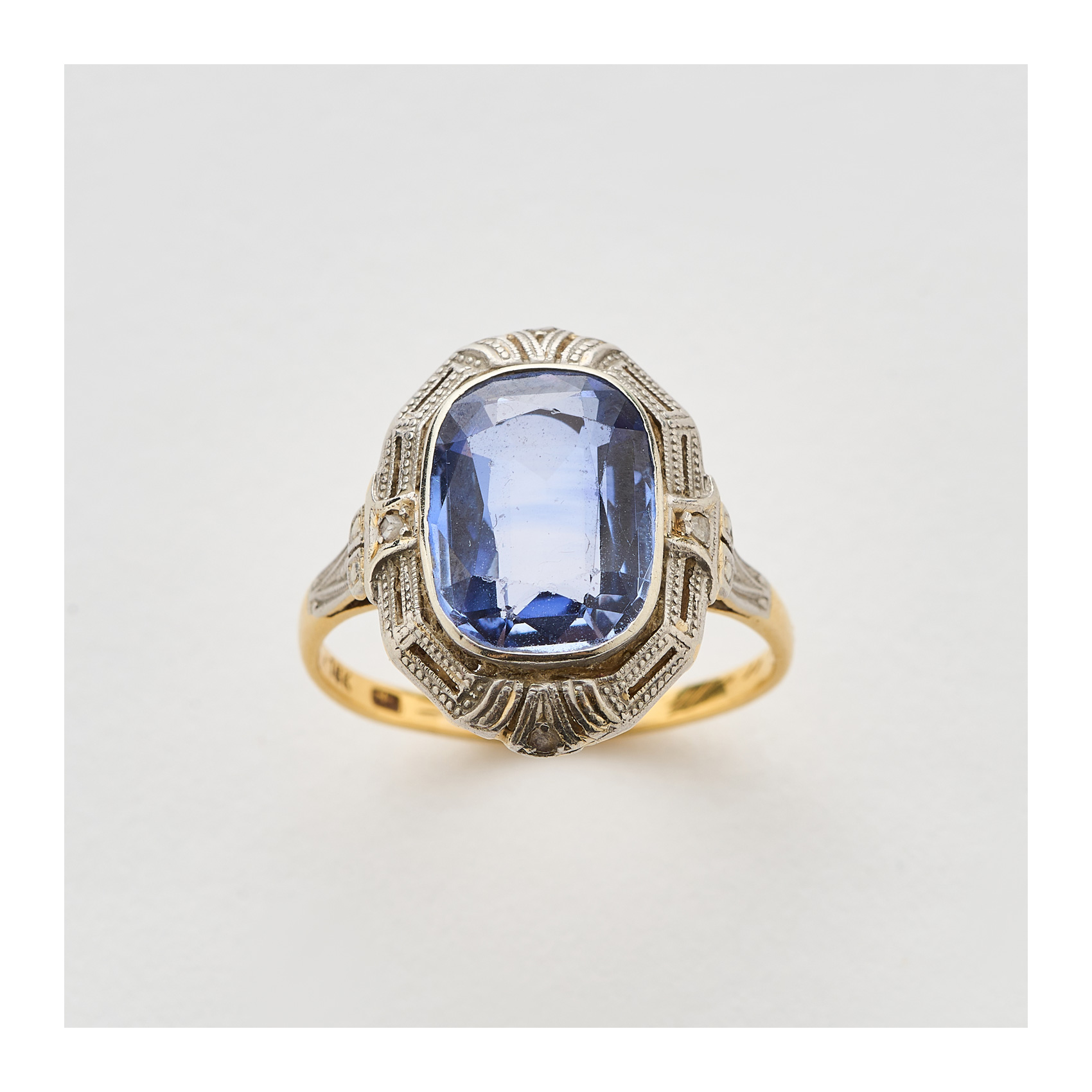 Sortija en oro y vistas en platino con símil de tanzanita de 12 X 9 mm, c. 1940.