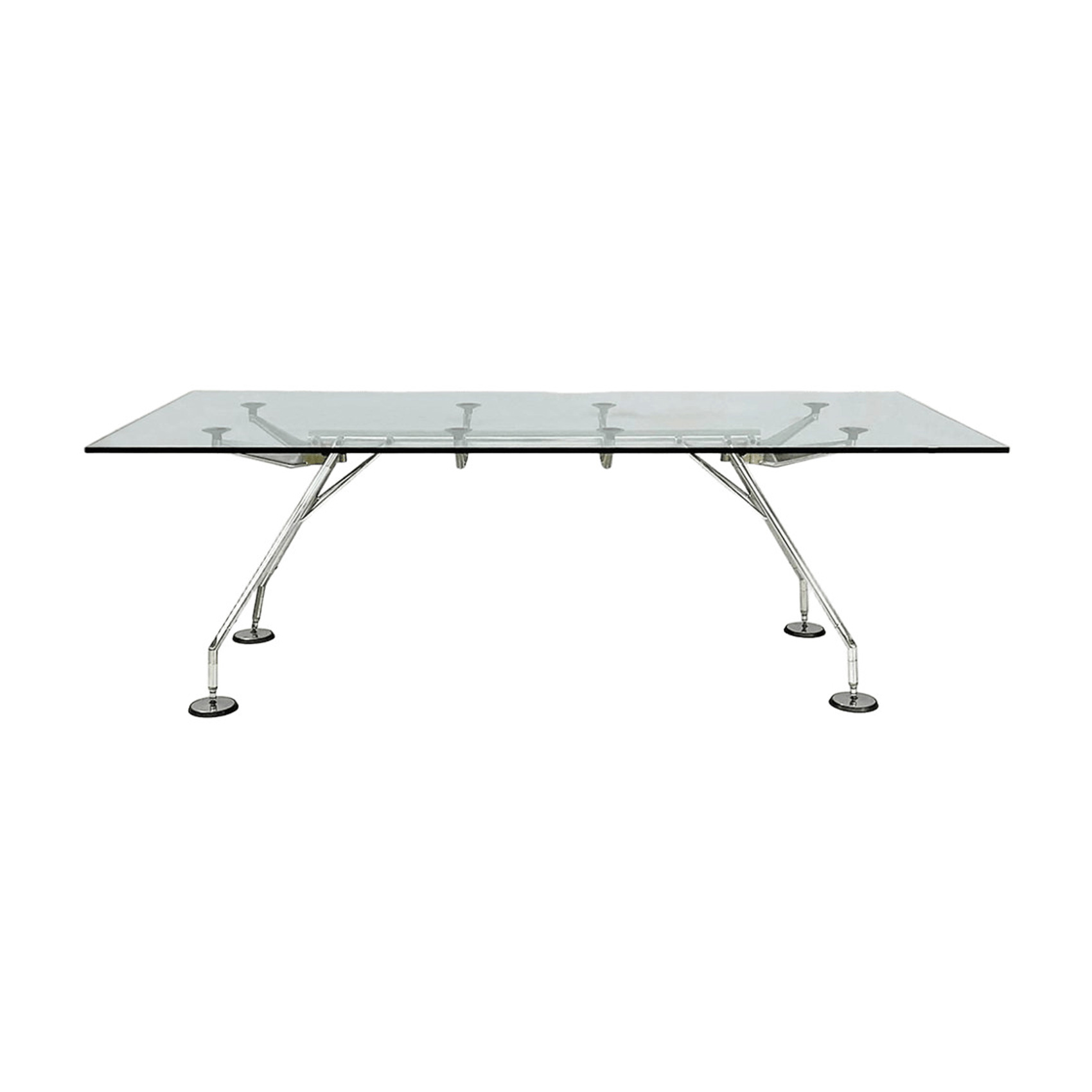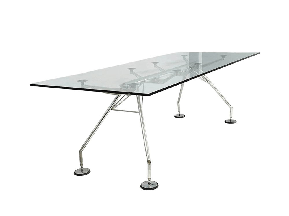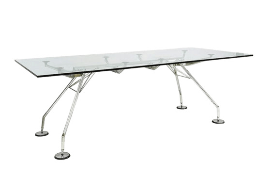 Mesa modelo «NOMOS 220» con estructura esqueleto en metal y aluminio cromado. Sobre en cristal templado transparente apoyado directamente sobre ventosas acolchadas. Sellos de origen.