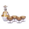 Lote de botella licorera y cuatro copas en cristal francés de Baccarat tallado y doblado en tonalidades ámbar y translúcida con decoración geométrica y de vides, mediados del s.XX. Gollete en plata punzonada. Alt. botella: 23,5 cm. Alt. copa: 7 cm. c/u. Estimación: 170 – 230 €.