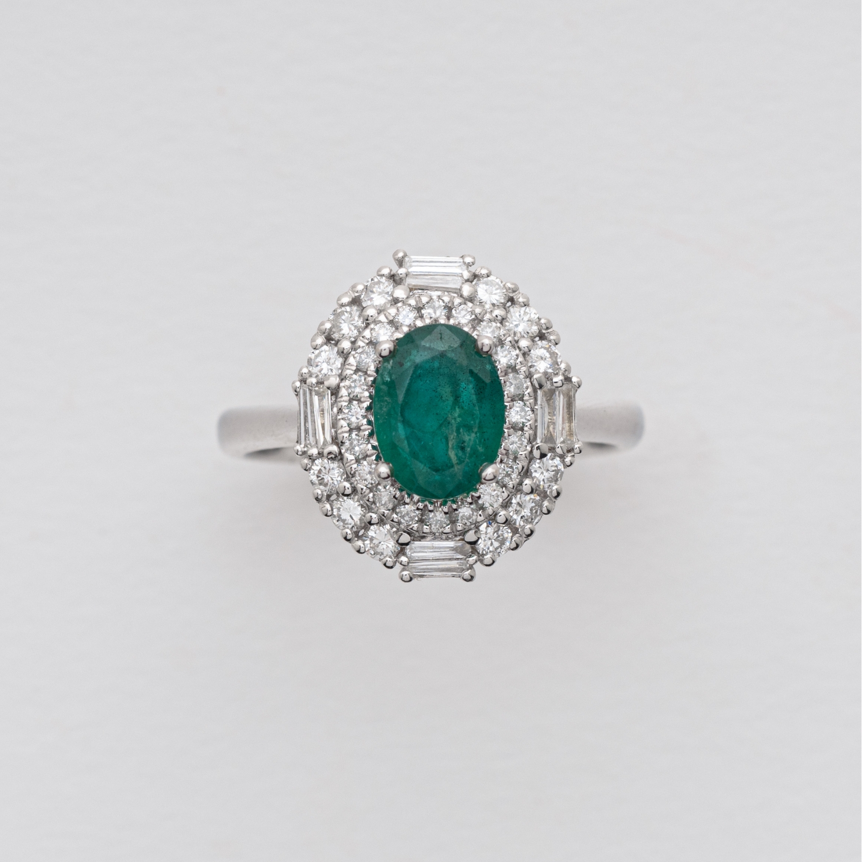 Sortija rosetón en oro blanco con esmeralda central, talla oval y doble orla de diamantes talla brillante y bagette.