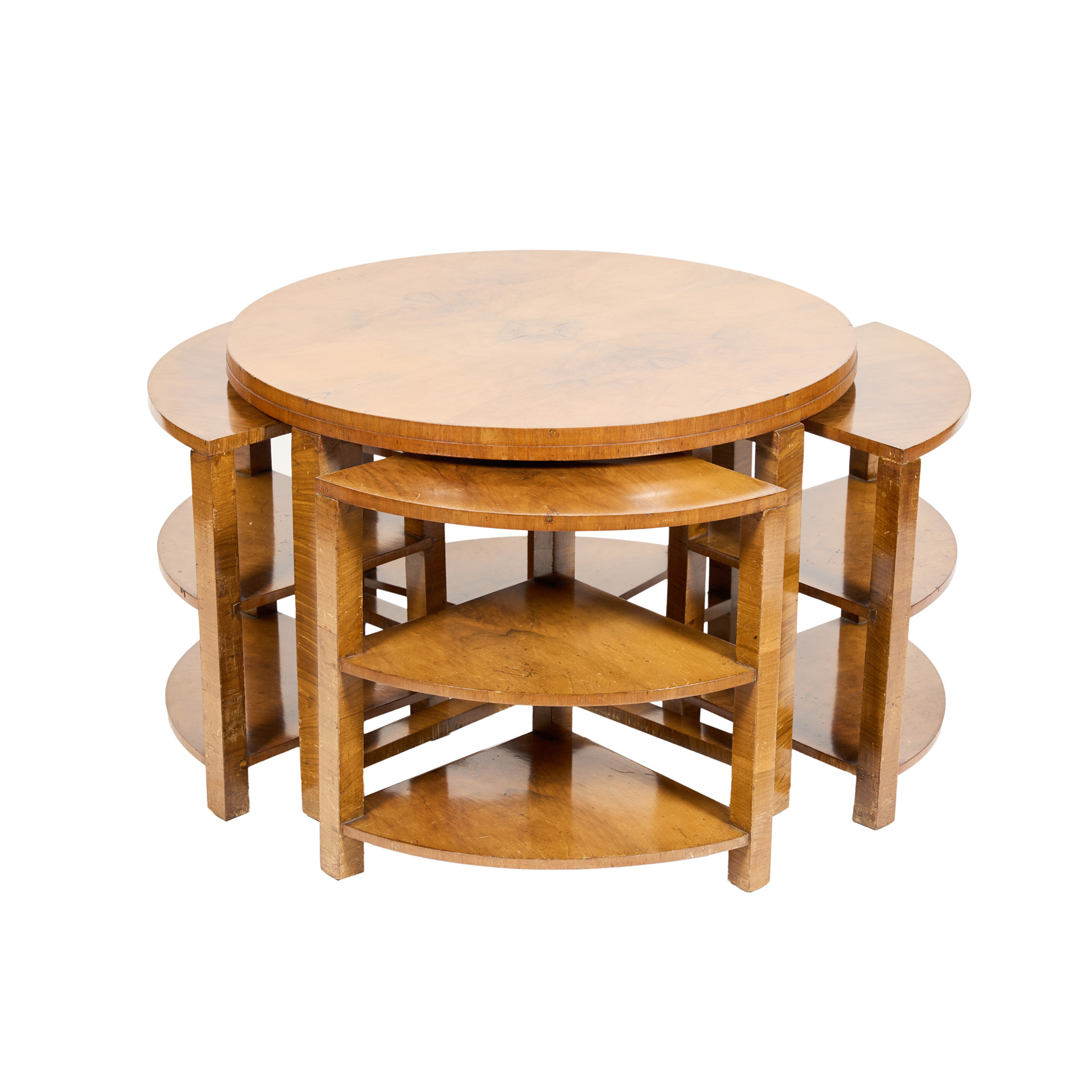 Mesa nido circular Art Deco en madera de nogal, ppios. del s.XX. Formada por mesa central y cuatro taburetes compartimentados por baldas.