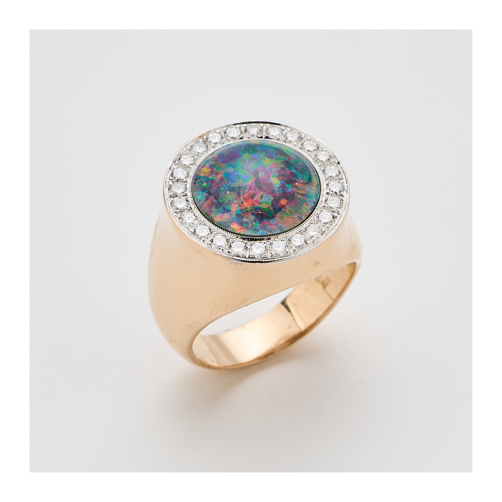 Sortija sello en oro bicolor con cabujón redondo de ópalo australiano de 10,5 mm. orlado por diamantes talla brillante.