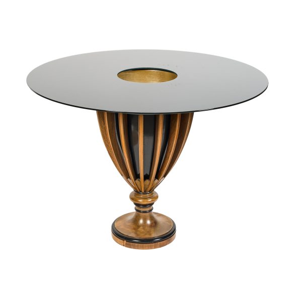 Mesa de centro con jardinera al centro, sobre en cristal y pie en forma de copa en madera de haya, s.XX.