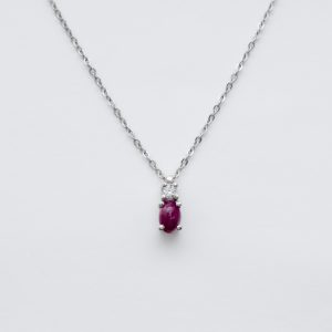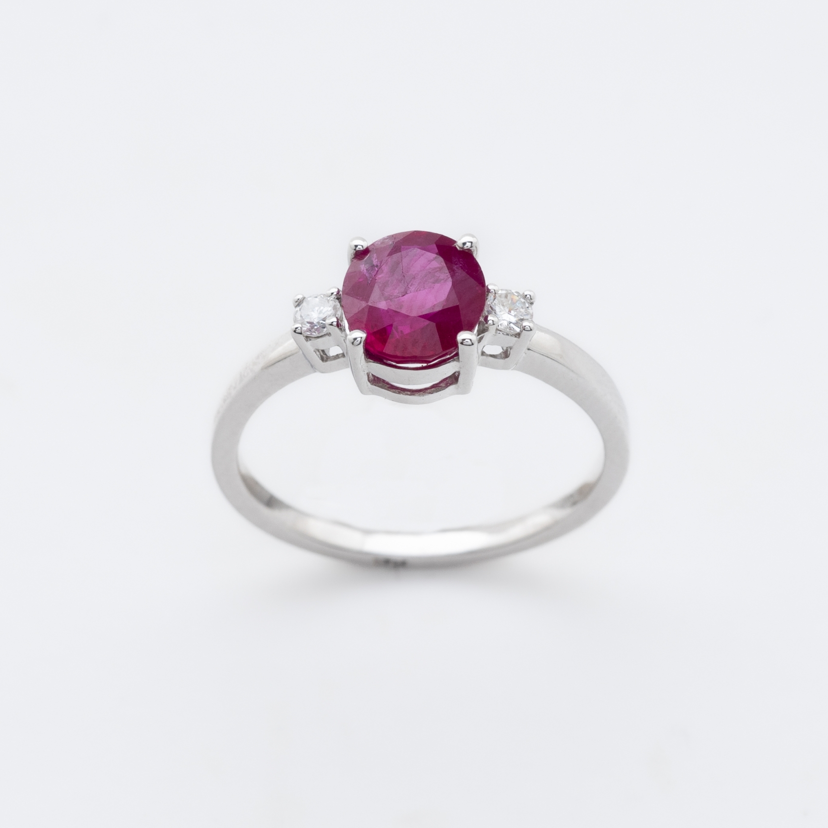 Sortija en oro blanco con rubí central talla oval custodiado por diamantes talla brillante engastados en garras.