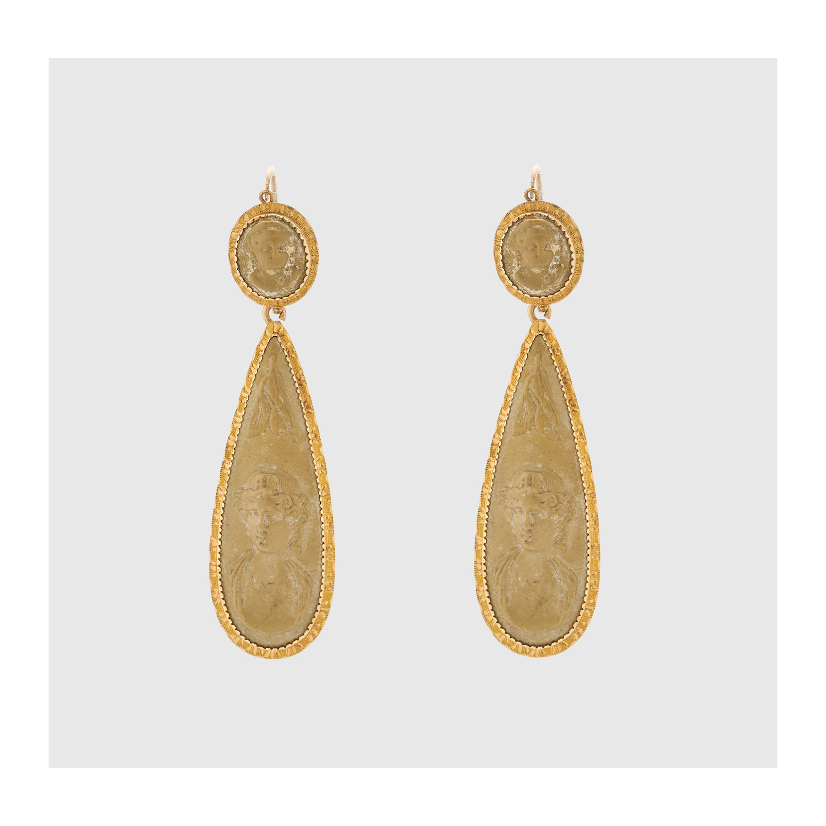 Pendientes largos victorianos en oro con camafeos de lava volcánica representando busto femenino, 6 cm.