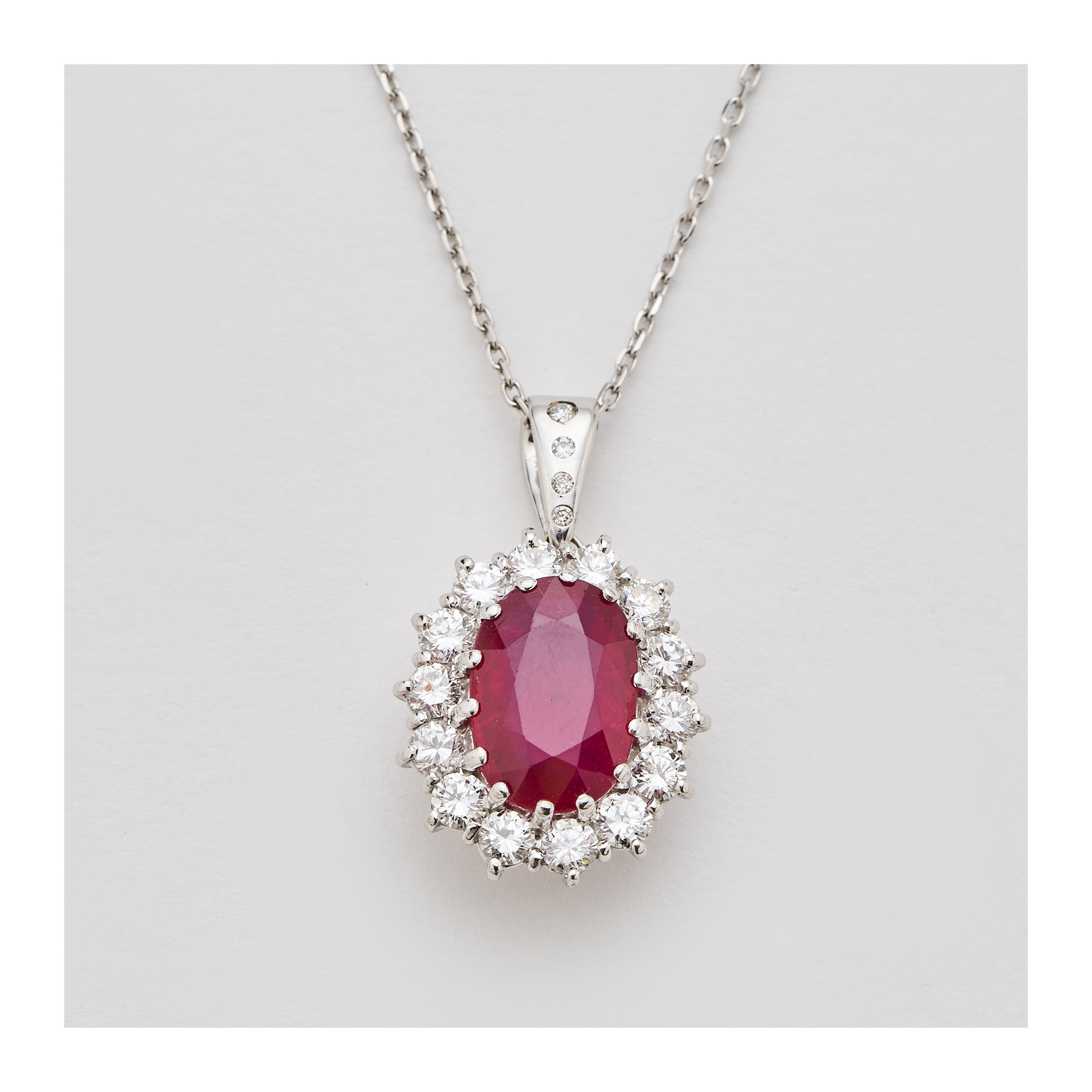 Colgante rosetón en oro blanco con rubí de Mozambique talla oval orlado por diamantes talla brillante.