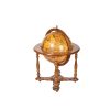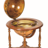 Mueble bar en madera torneada en forma de globo terráqueo con tapa abatible, s.XX. Interior giratorio compartimentado para botellas y vasos. Apoya sobre ruedas.