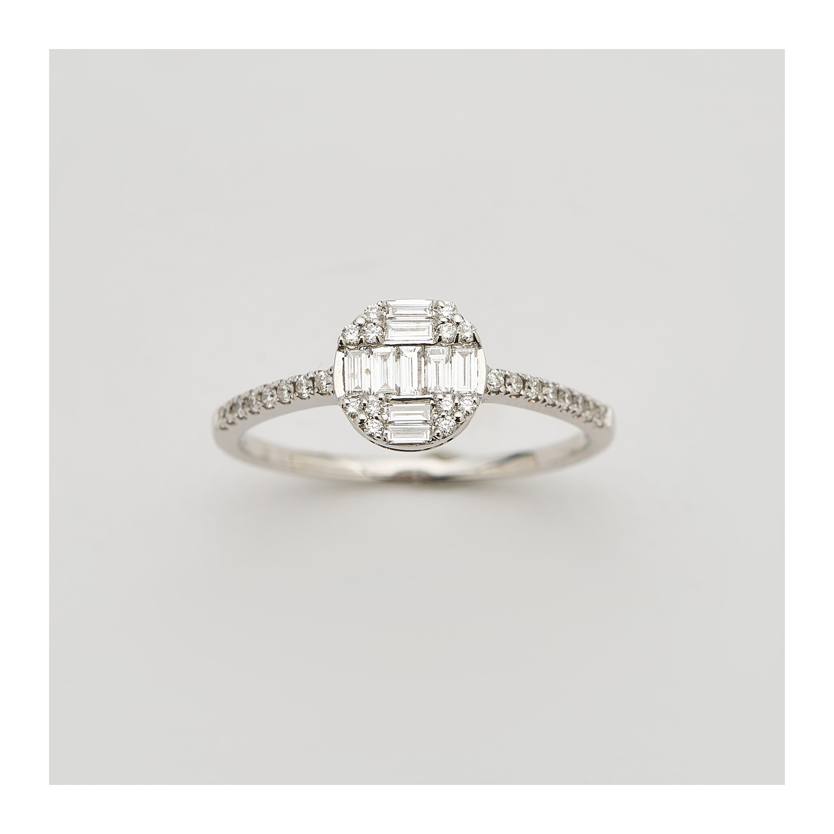 Sortija en oro blanco con centro y brazos de diamantes tallas brillante y baguette.