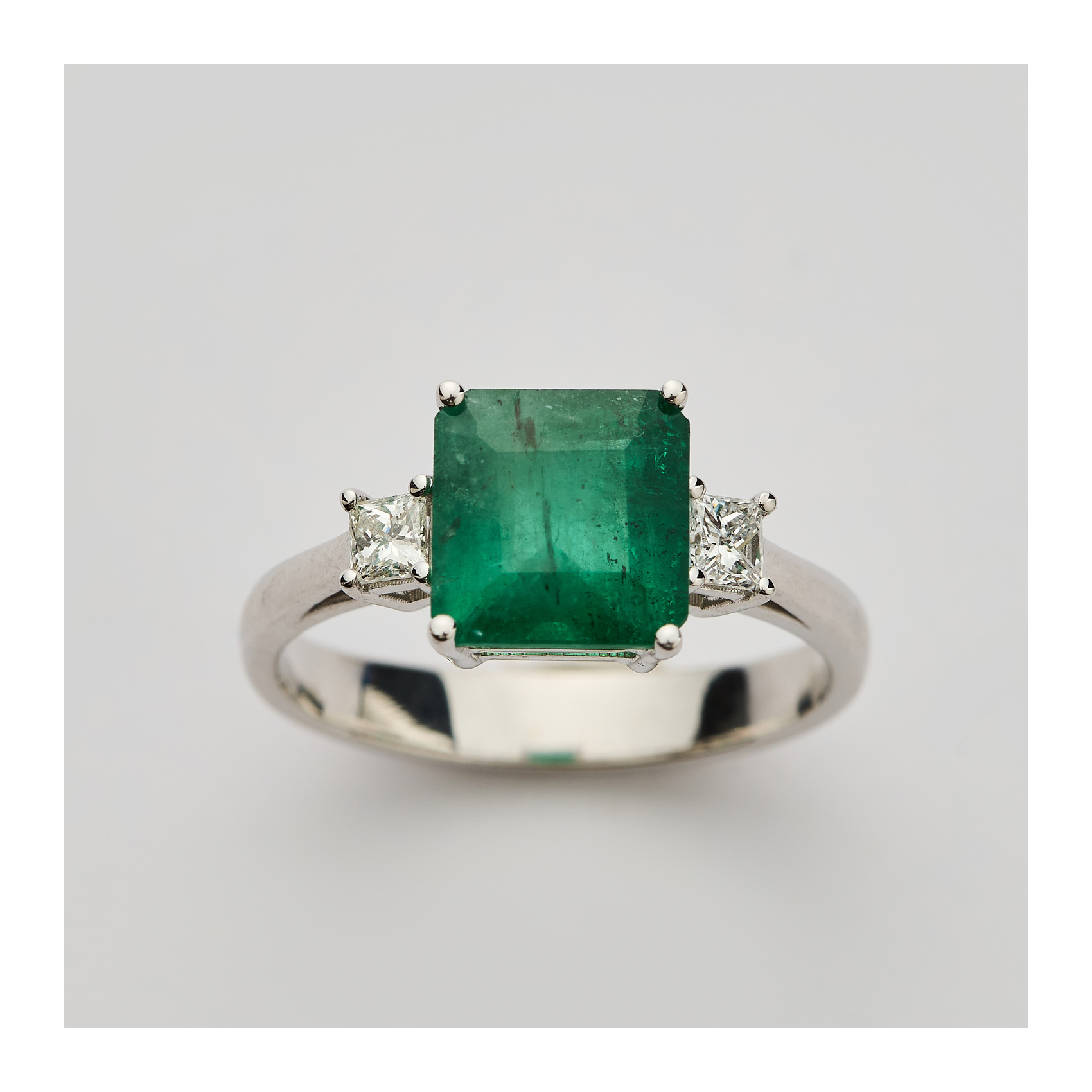 Sortija en oro blanco con esmeralda talla carré custodiada por diamantes de talla princesa engastados en garras.