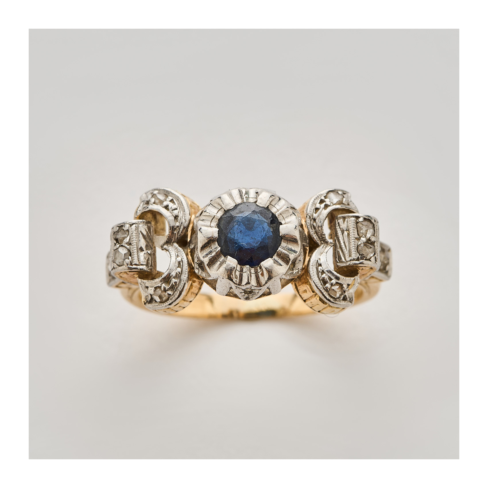 Sortija en oro y vistas en platino con símil de zafiro azul talla redonda custodiado por diamantes talla rosa 3/3, c.1940.
