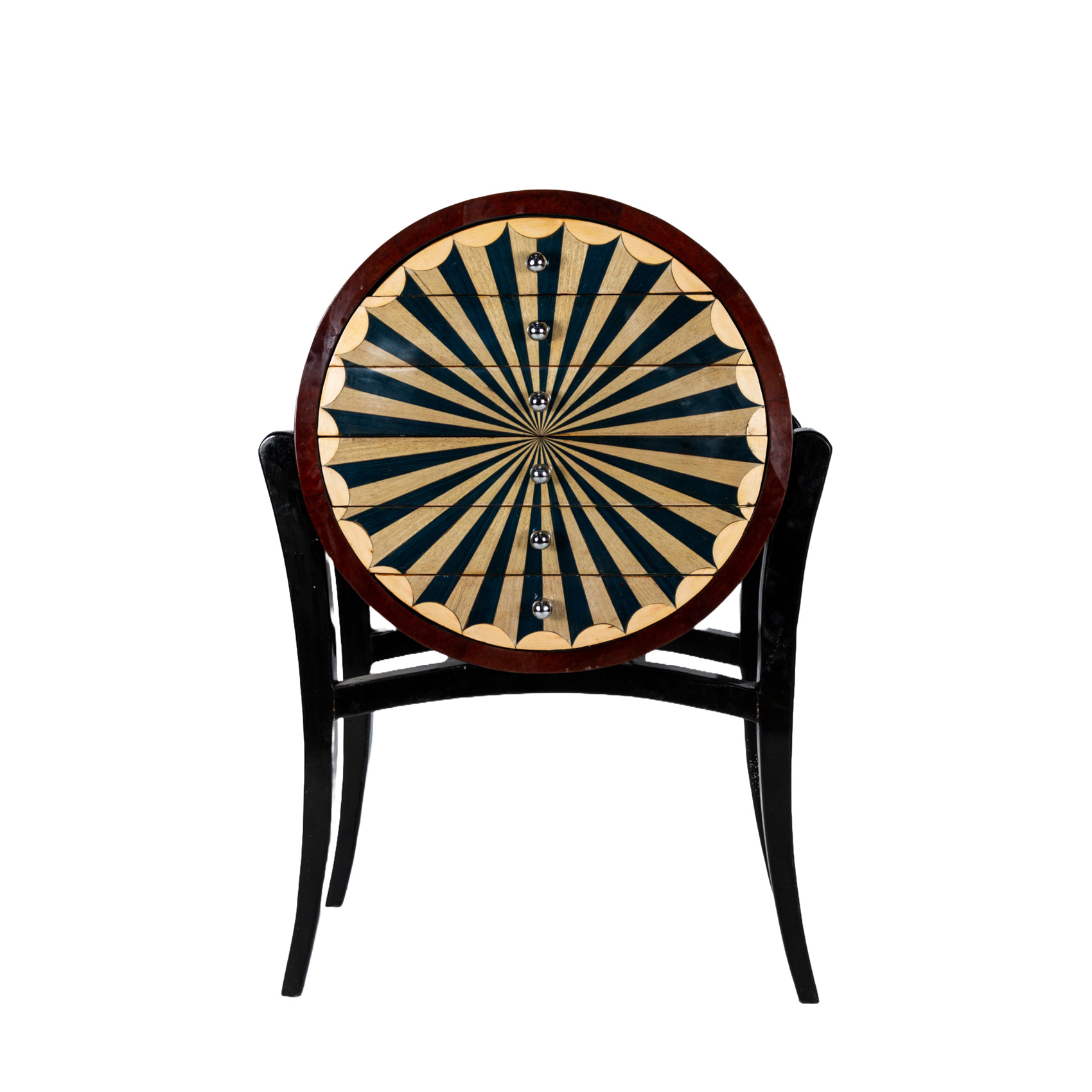 Cómoda de diseño circular estilo Mid Century con decoración geométrica en marqueterias con seis cajones al frente, s.XX. Apoya sobre estructura de patas galveadas.