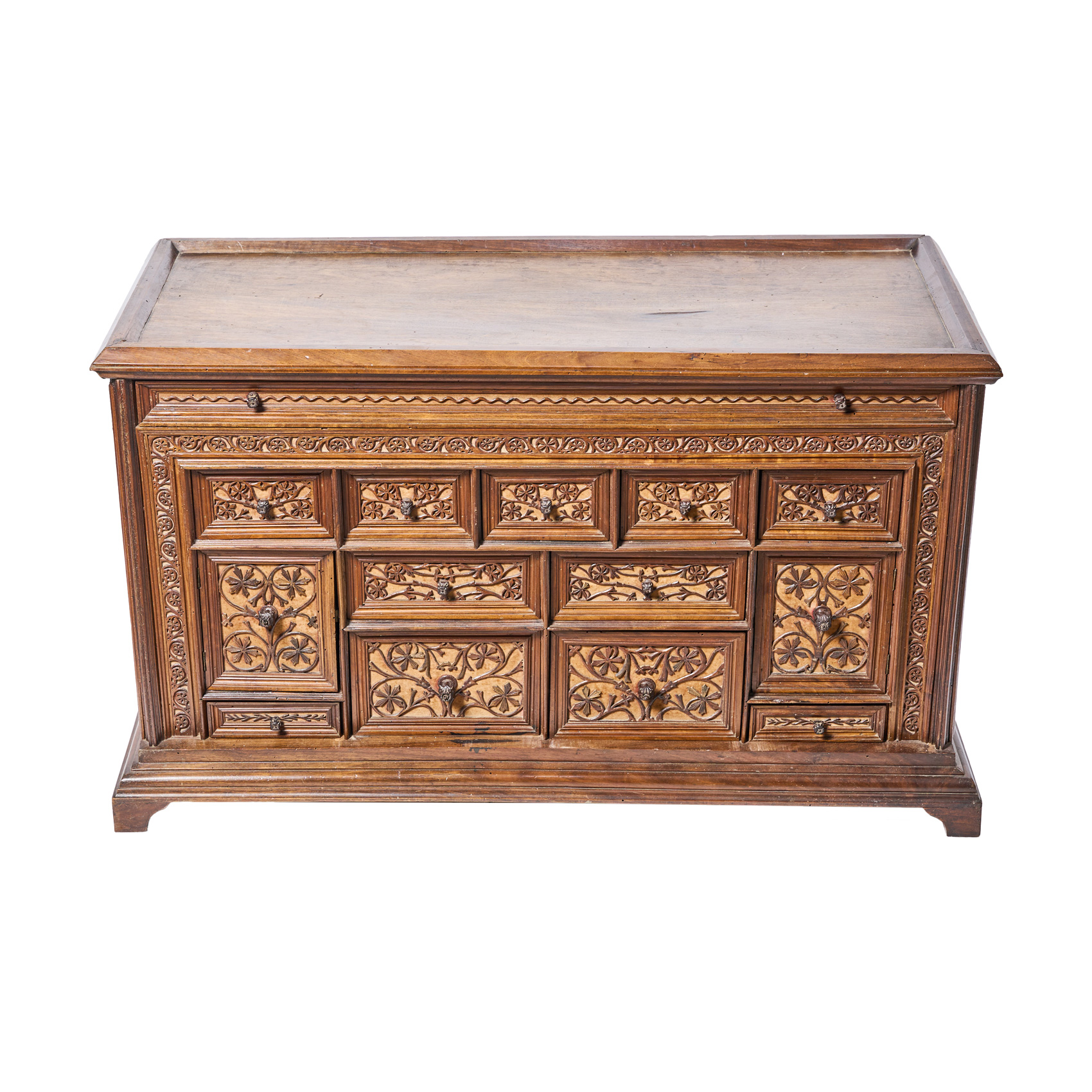Arquilla en madera tallada de nogal, s.XIX. Frente con catorce gavetas con decoraciones de motivos florales en relieve y tiradores forma de flor.