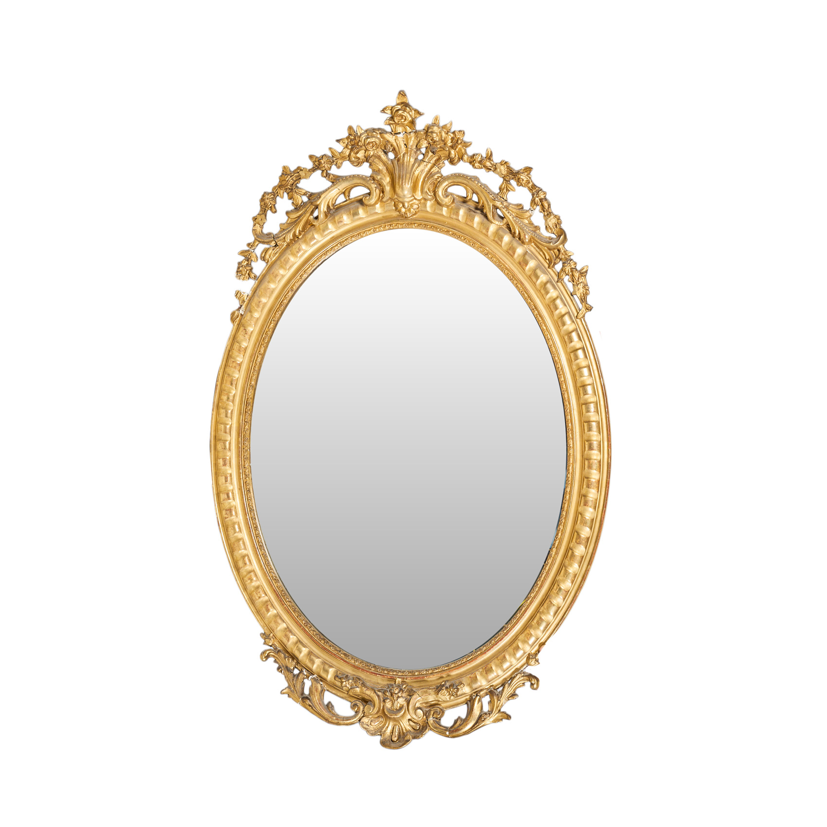 Espejo ovalado estilo isabelino en madera tallada y dorada rematado por girnalda de flores, fles. del s.XIX.