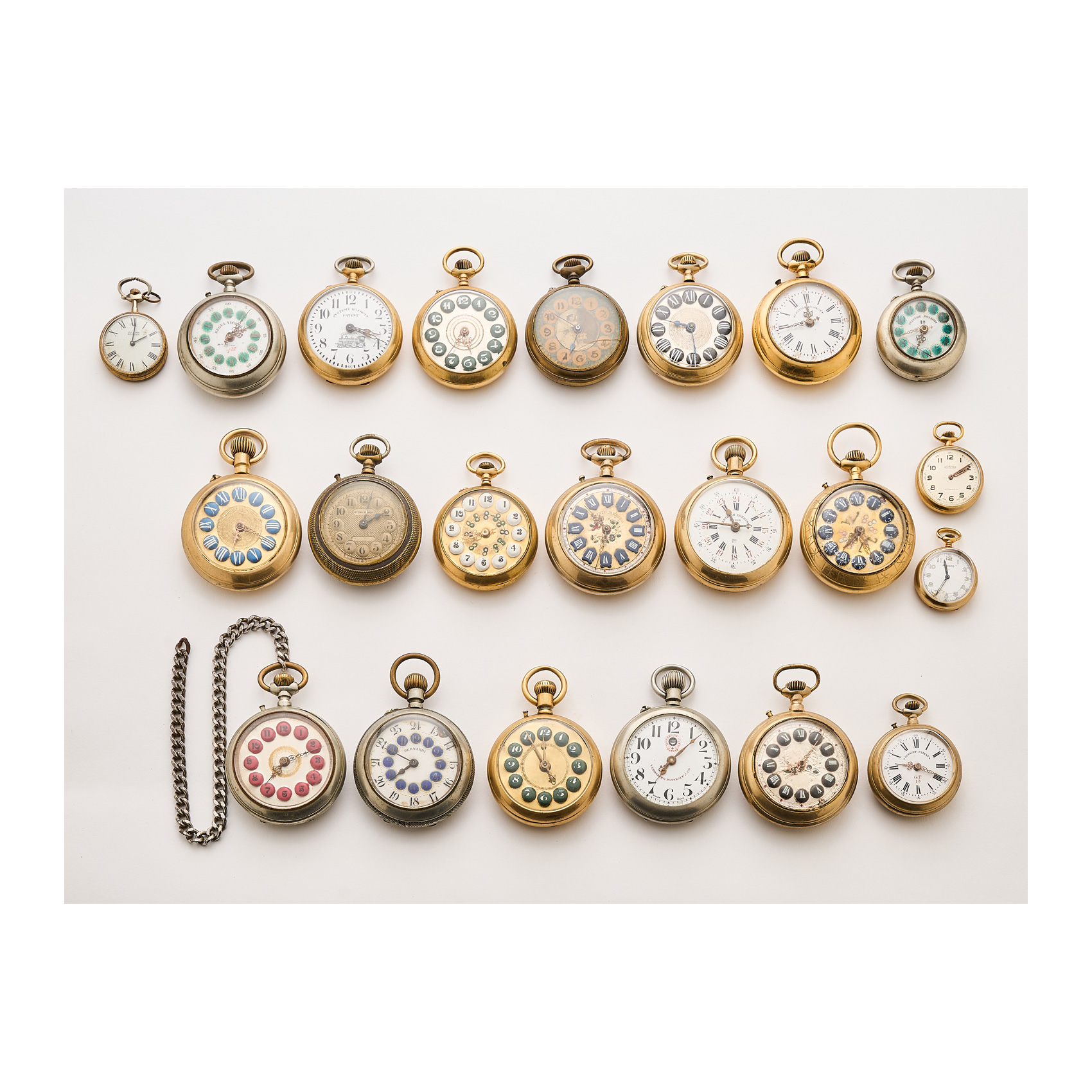 Lote de 22 relojes de bolsillo en metal dorado y plateado en diversas marcas y medidas, Systeme Roskopf, Bernardi, Regulador, Roamer, Pronto,Vuillemin Regnier y Antonio Cordero. Mecanismo de cuerda manual.