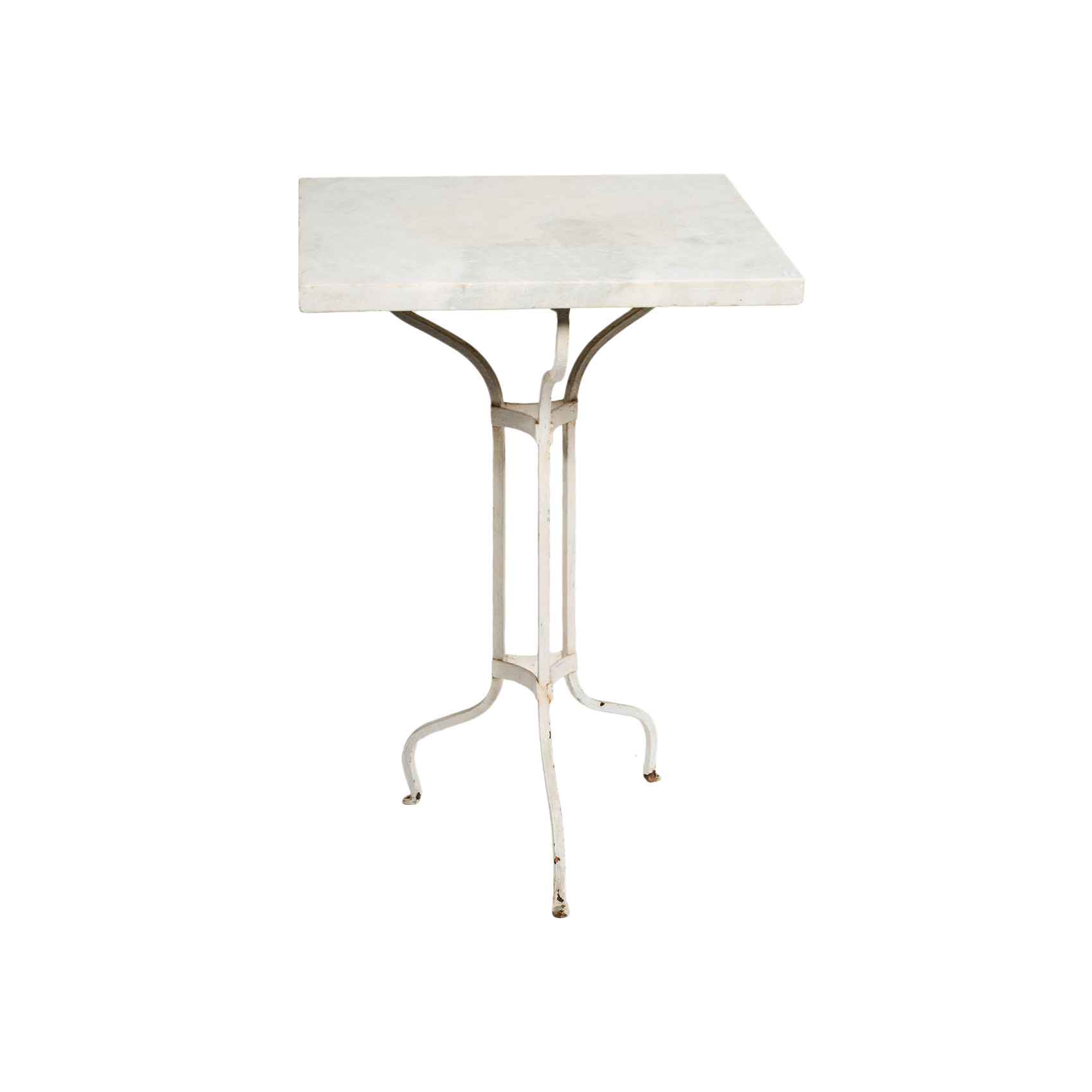 Mesa auxilar cuadrangular con sobre en mármol blanco y pie en forja, s.XX.