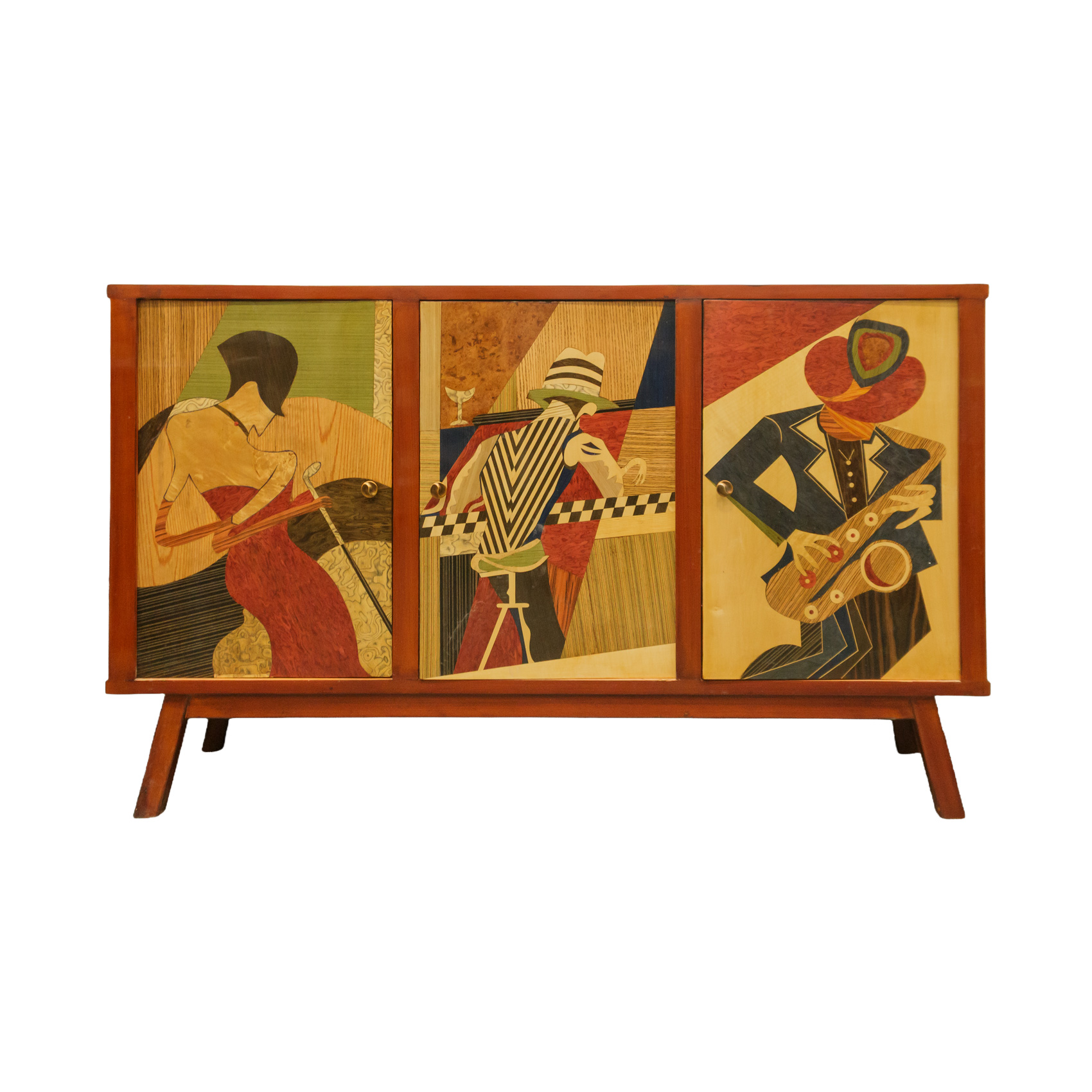 Aparador estilo Mid Century en madera chapada de diferentes tonalidades formando escenas de músicos de Jazz, s.XX. Distribuido en tres puertas batientes.