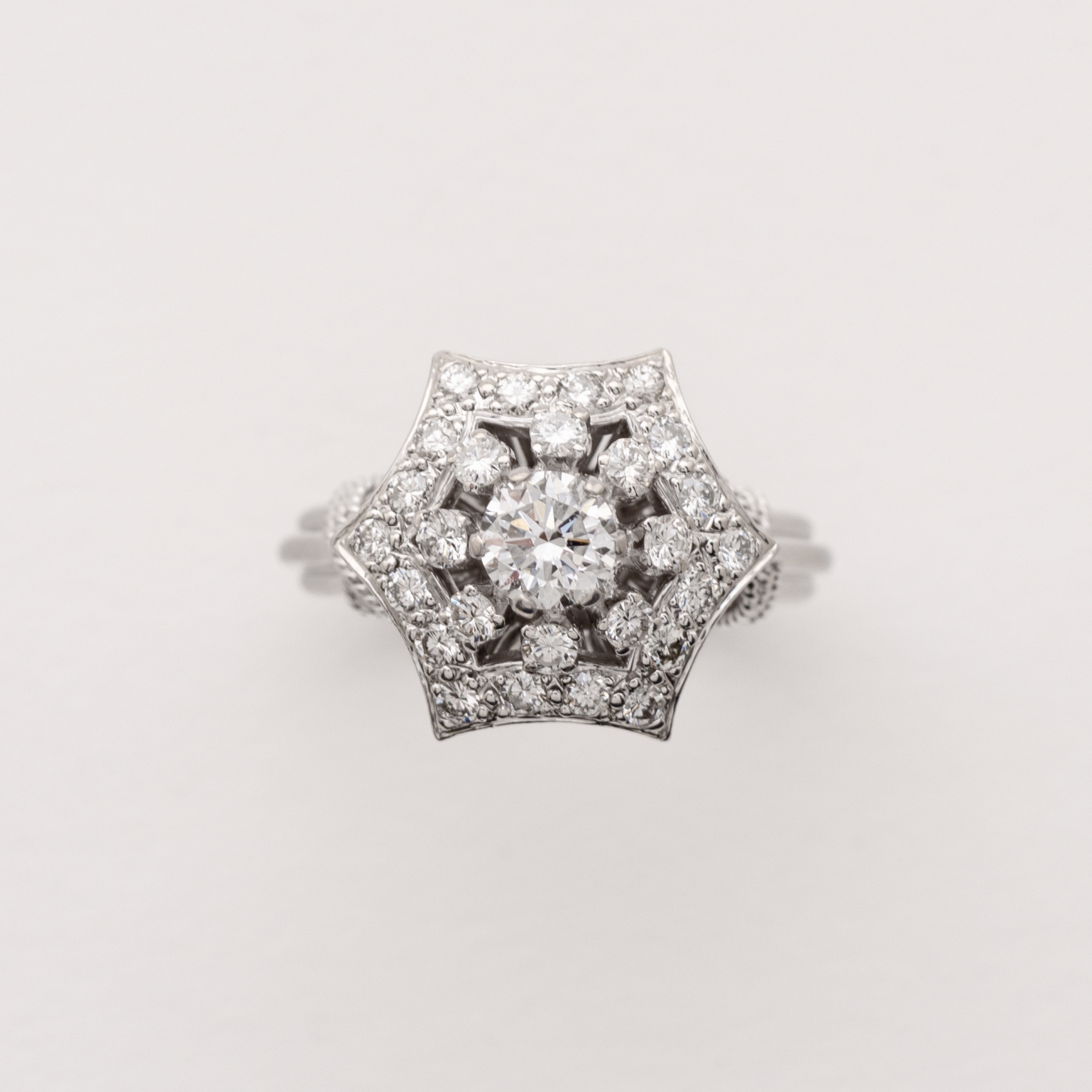 Sortija diseño estrella en oro blanco con rosetón central y orla de diamantes talla brillante. Parte inferior con decoración de cordoncillo.