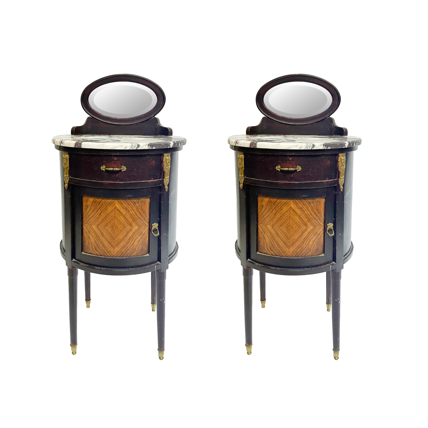 Pareja de mesitas de noche en madera tallada y chapada con sobre en mármol blanco veteado, rematadas por pequeño espejo biselado, cajón en cintura y puerta batiente al centro, ppios. del s.XX.