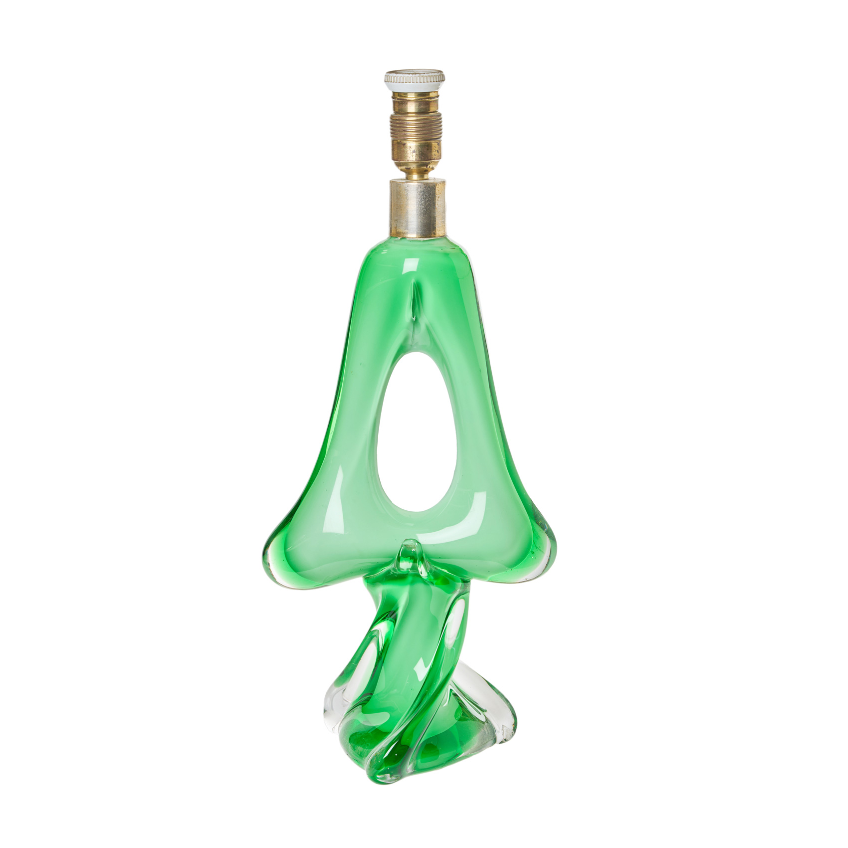 Lámpara de sobremesa en cristal de Murano «sommerso» de tonalidad verde con portalámparas en latón dorado con sistema de cadena de tiro, s.XX.