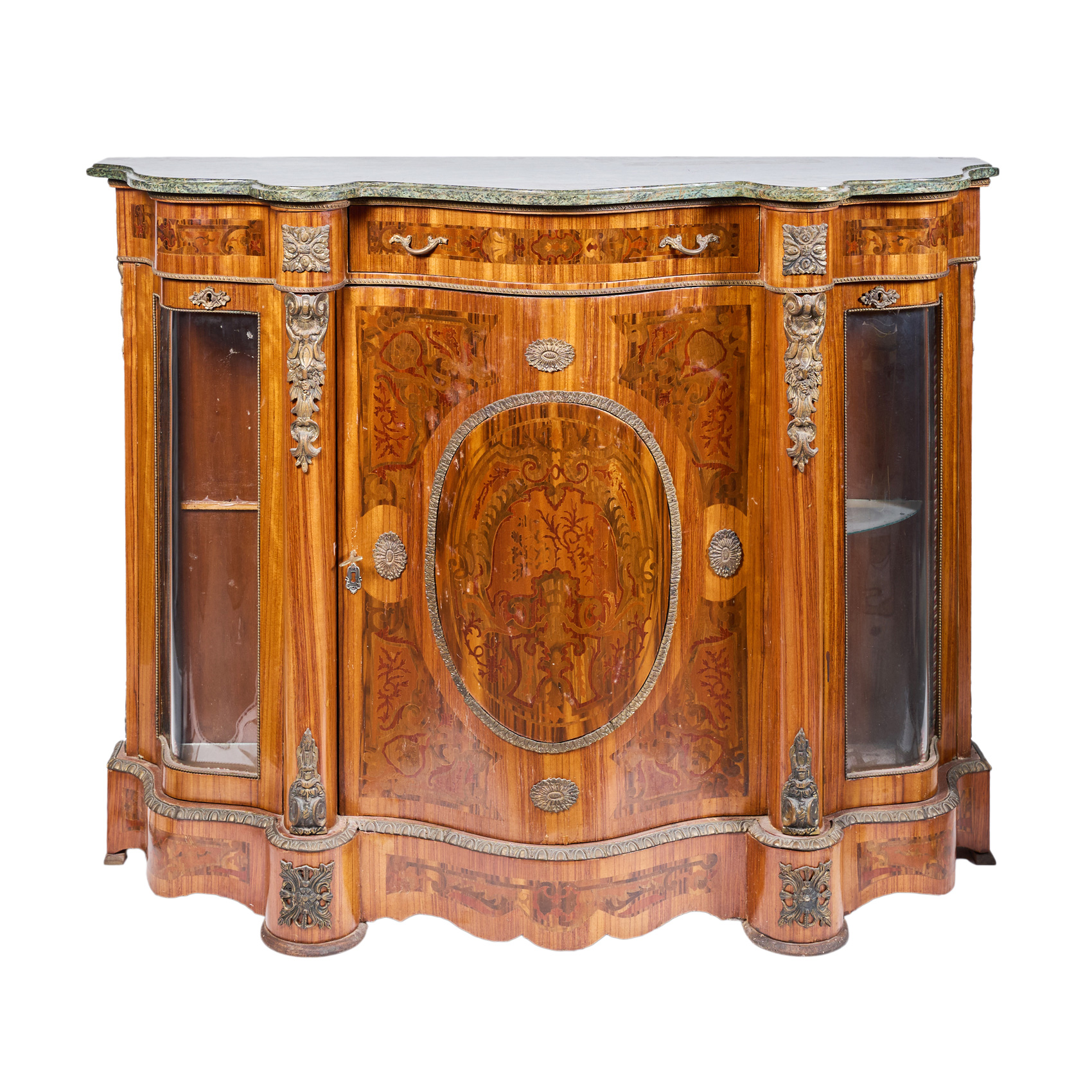 Aparador francés estilo Luis XVI en madera chapada de raíz con marqueterías de motivos vegetales y florales con aplicaciones en latón, fles. del s.XIX-ppios. s.XX. Frente con cajón superior y puerta batiente. Presenta dos puertas acristaladas en los laterales y sobre en mármol verde veteado. Adjunta llave.