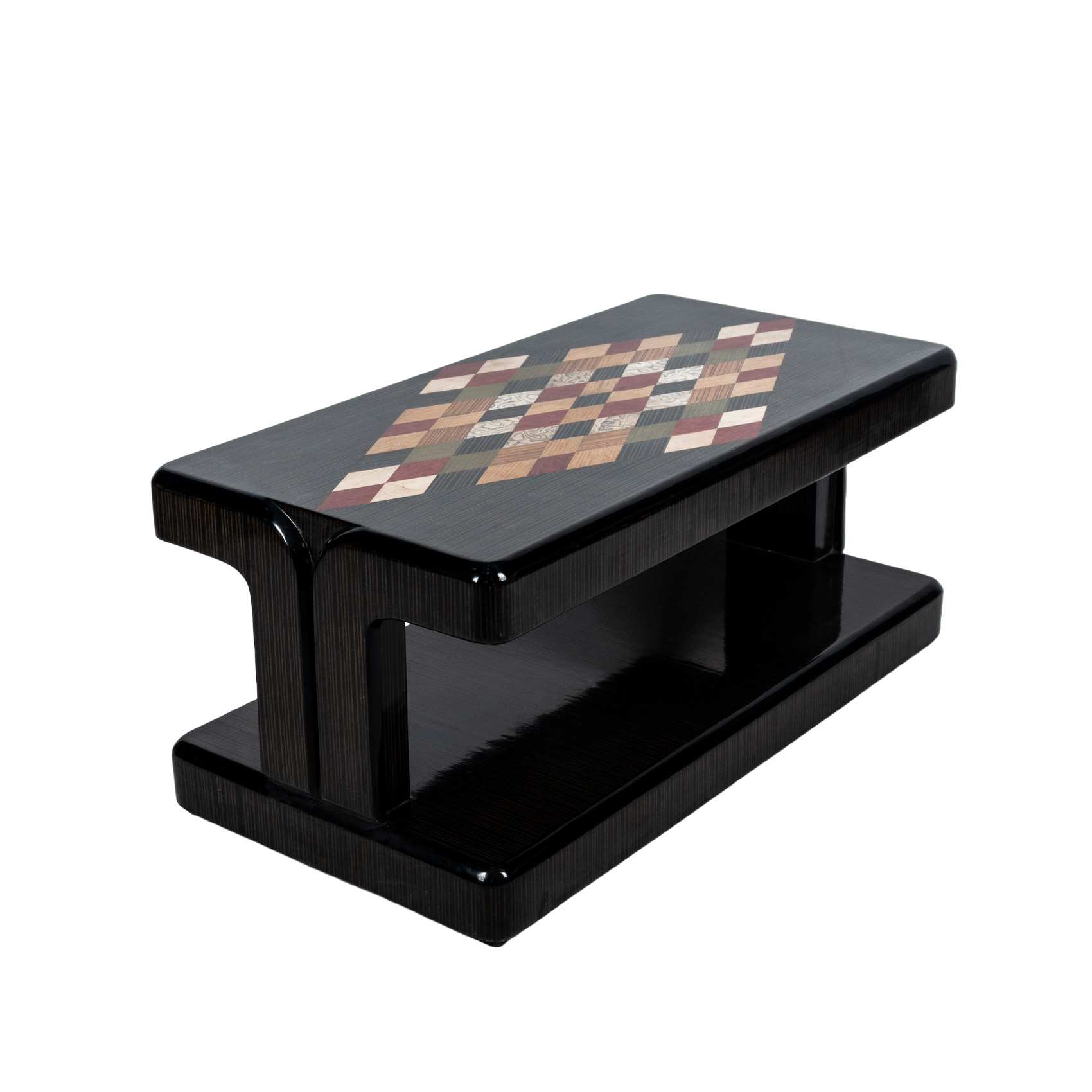 Mesa baja de centro en madera chapada con decoración de motivo ajedrezado de diferentes tonalidades en el sobre, s.XX.