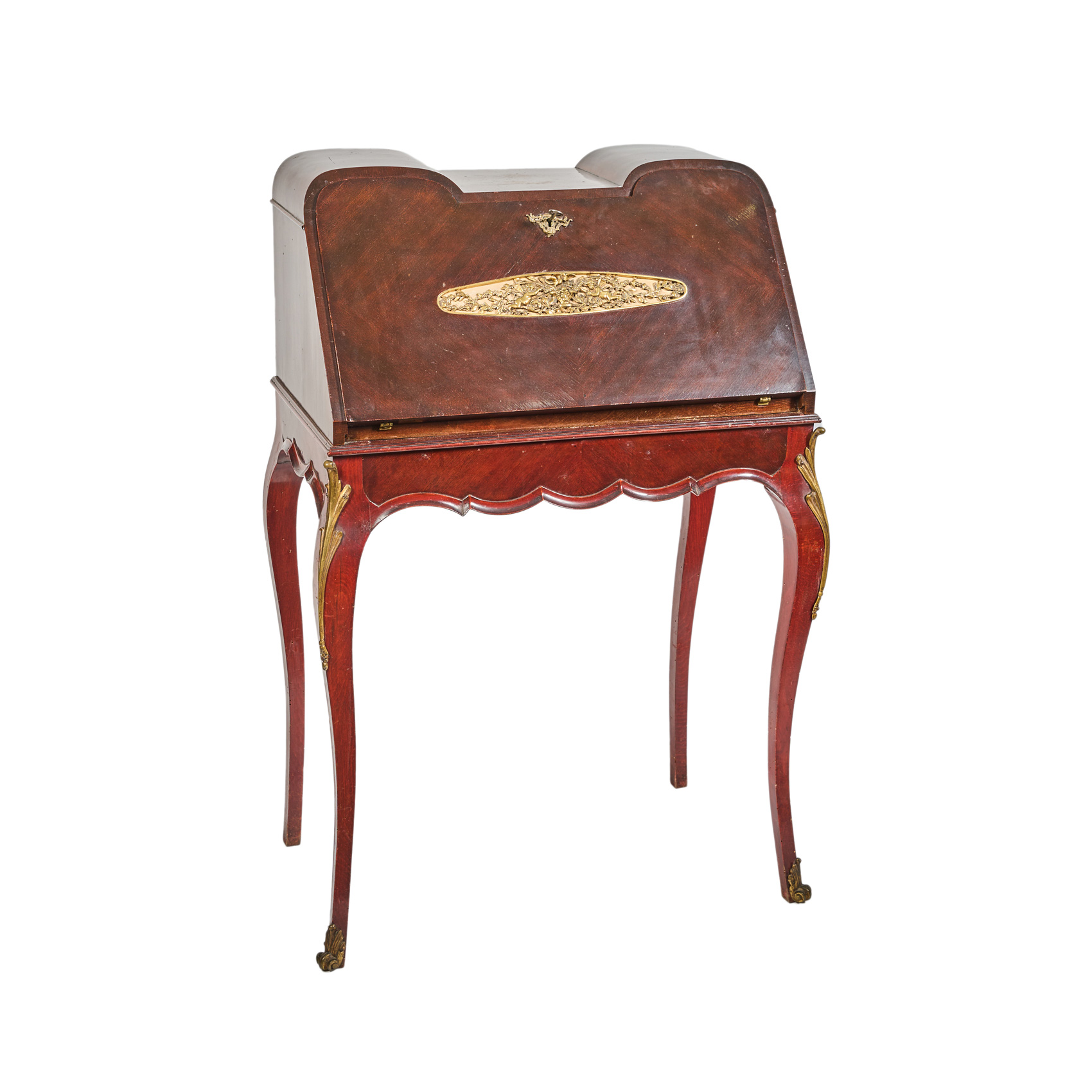 Bureau de dama en madera de cedro con frente abatible e interior compartimentado con cuatro cajones, c.1920-1930. Calzos, remates, medallones y bocallave en latón dorado.