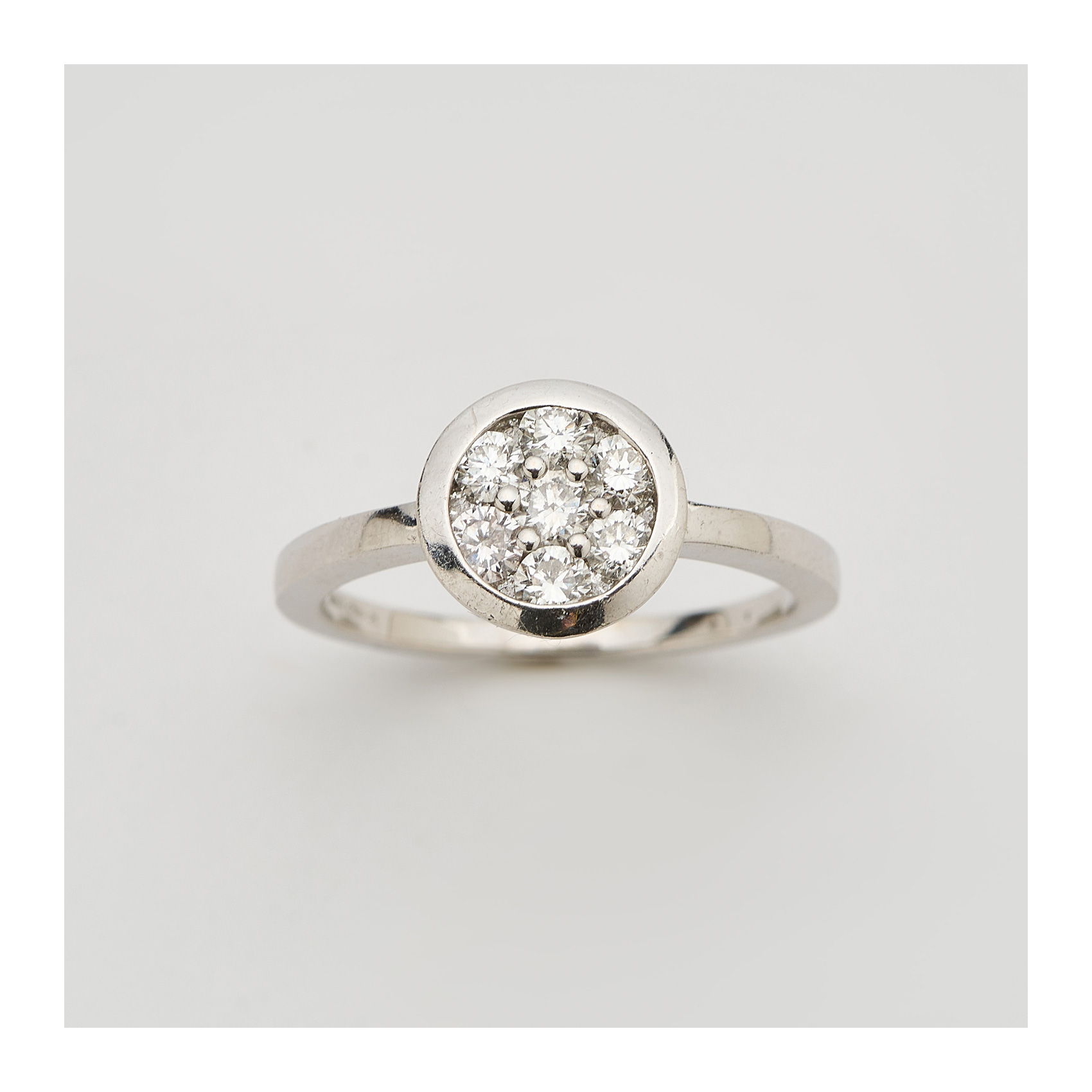 Sortija diseño circular en oro blanco con rosetón central de diamantes talla brillante.