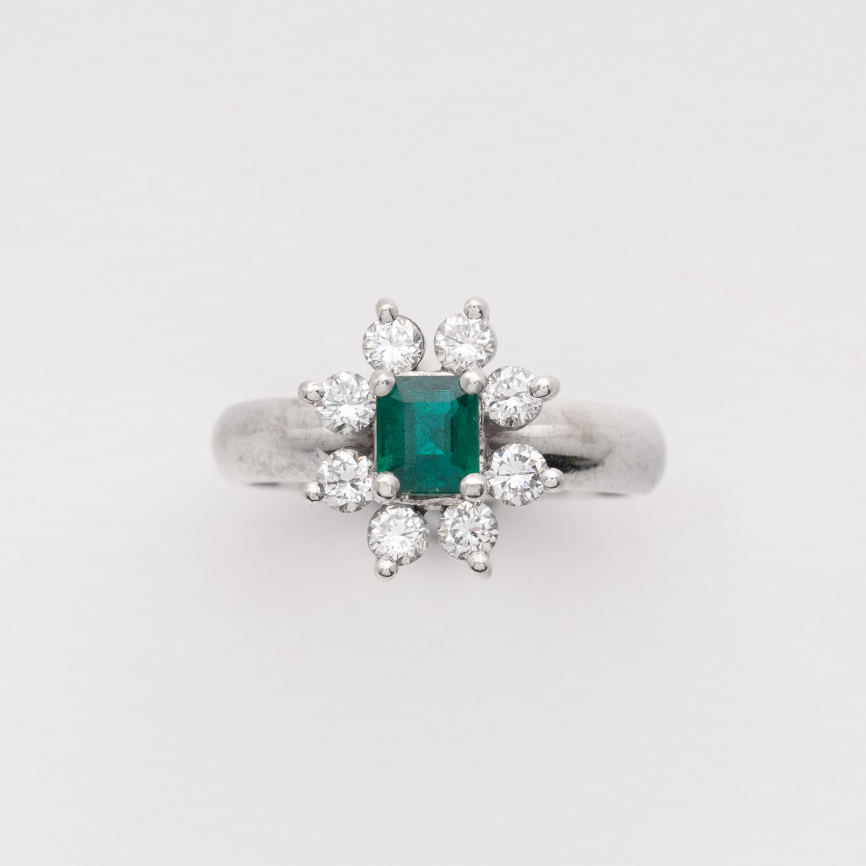 Sortija rosetón en oro blanco con esmeralda talla octogonal orlada por diamantes talla brillante.