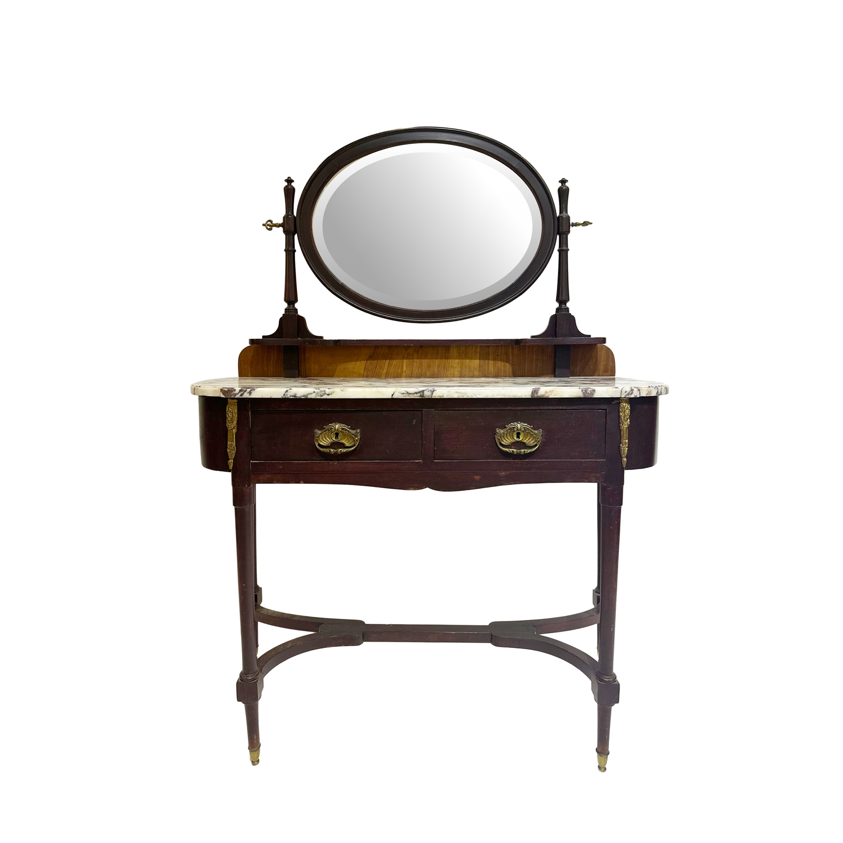 Tocador en madera tallada con dos cajones al frente, sobre en mármol blanco veteado y rematado por espejo basculante, ppios. del s.XX.