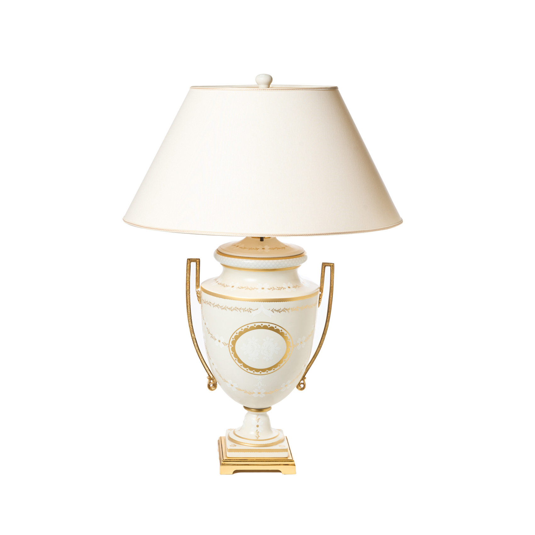 Lámpara de sobremesa de dos luces con base en forma de jarrón neoclásico en porcelana esmaltada con fileteados en dorado y motivos florales, s.XX. Pantalla en tonalidad crema. Marcas en la base.