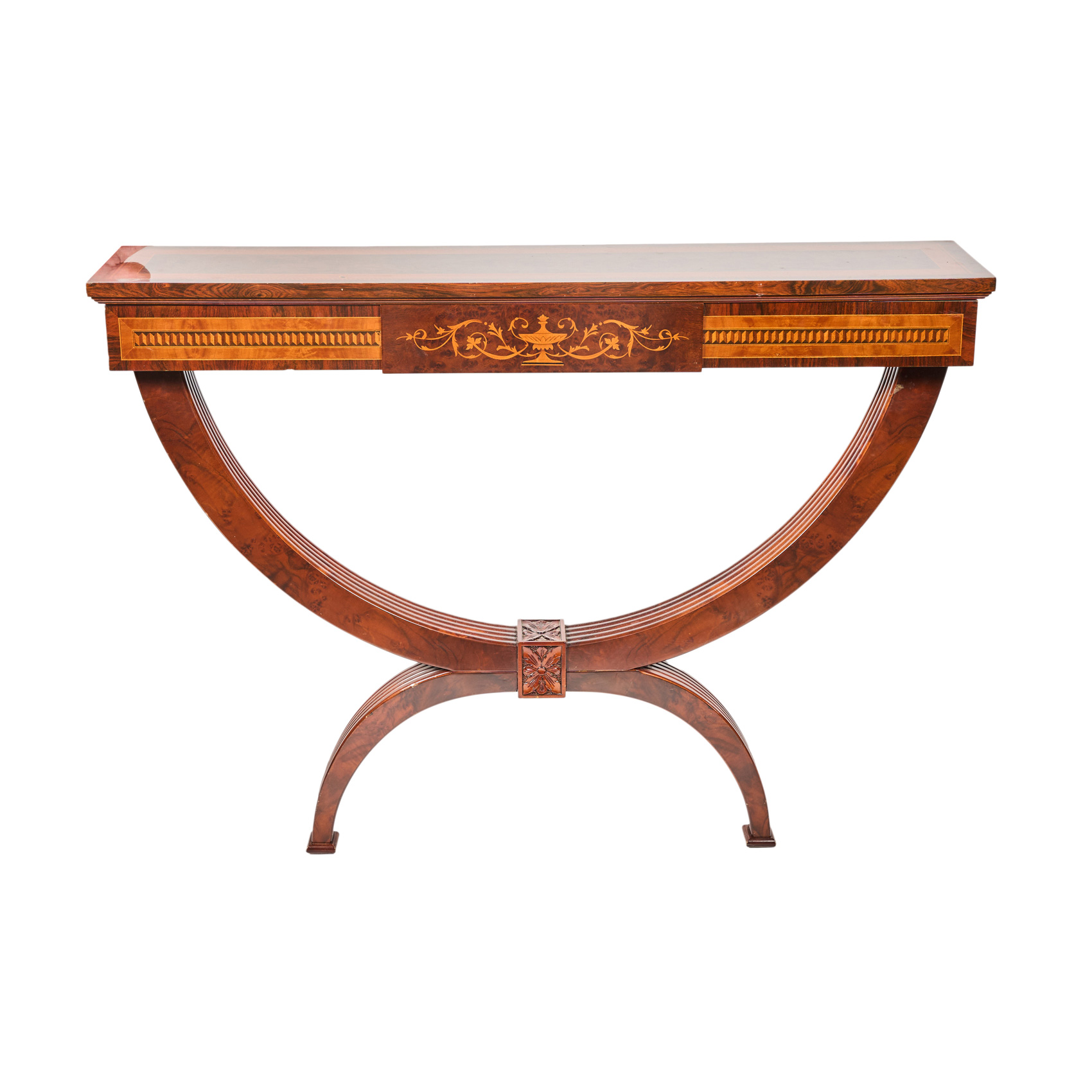 Consola estilo Art Deco en madera de caoba, nogal y palisandro con cajón al centro y pie de arco, s.XX. Con decoración de marqueterías geométricas y florales.