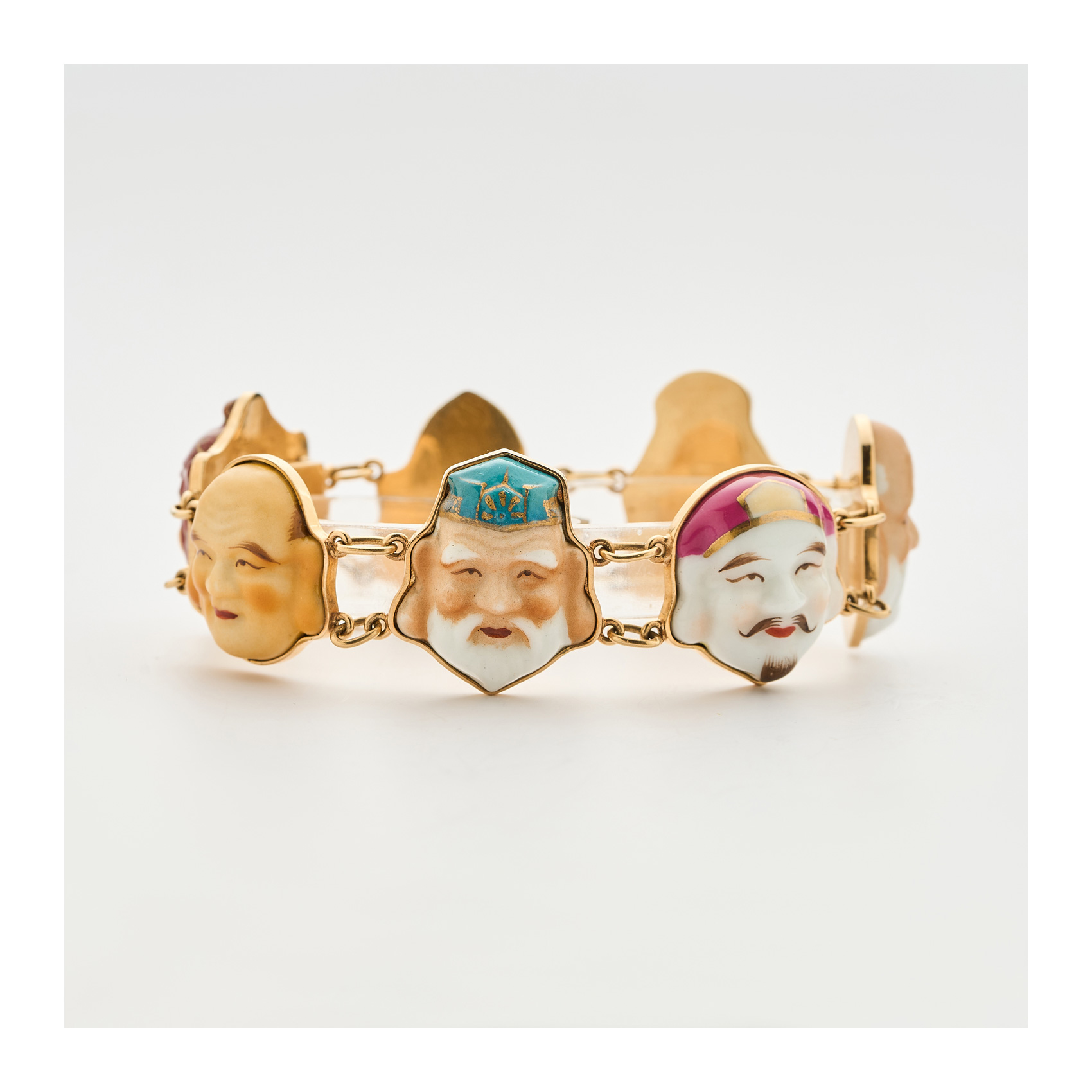 Pulsera Toshikane en oro con los siete dioses de la felicidad y la fortuna en porcelana policromada, c.1970. Cierre de lengüeta con cadenita de seguridad.