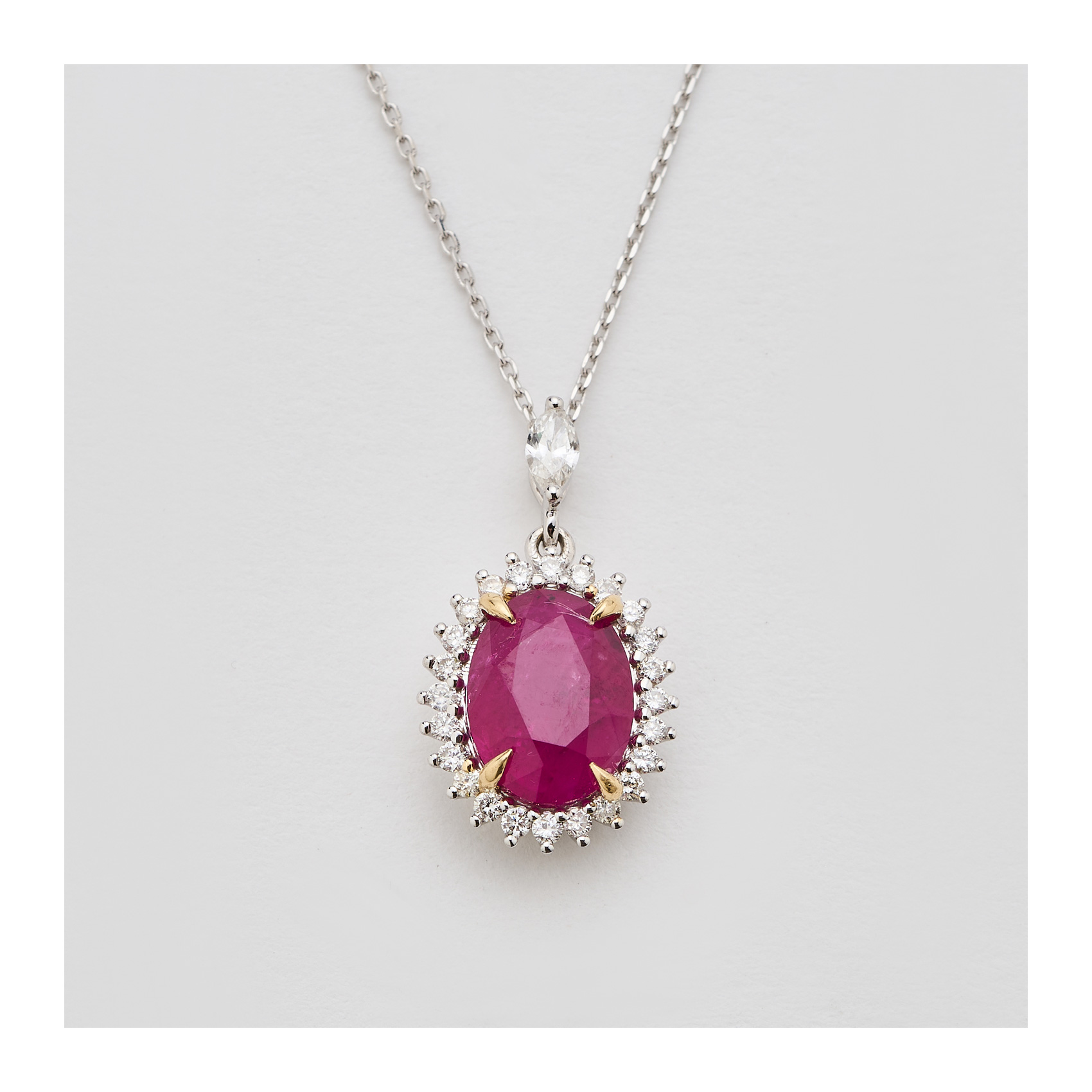 Colgante rosetón en oro blanco con rubí de Myanmar (Burma) talla oval orlado por diamantes talla brillante y coronado por diamante talla marquise engastados en garras.