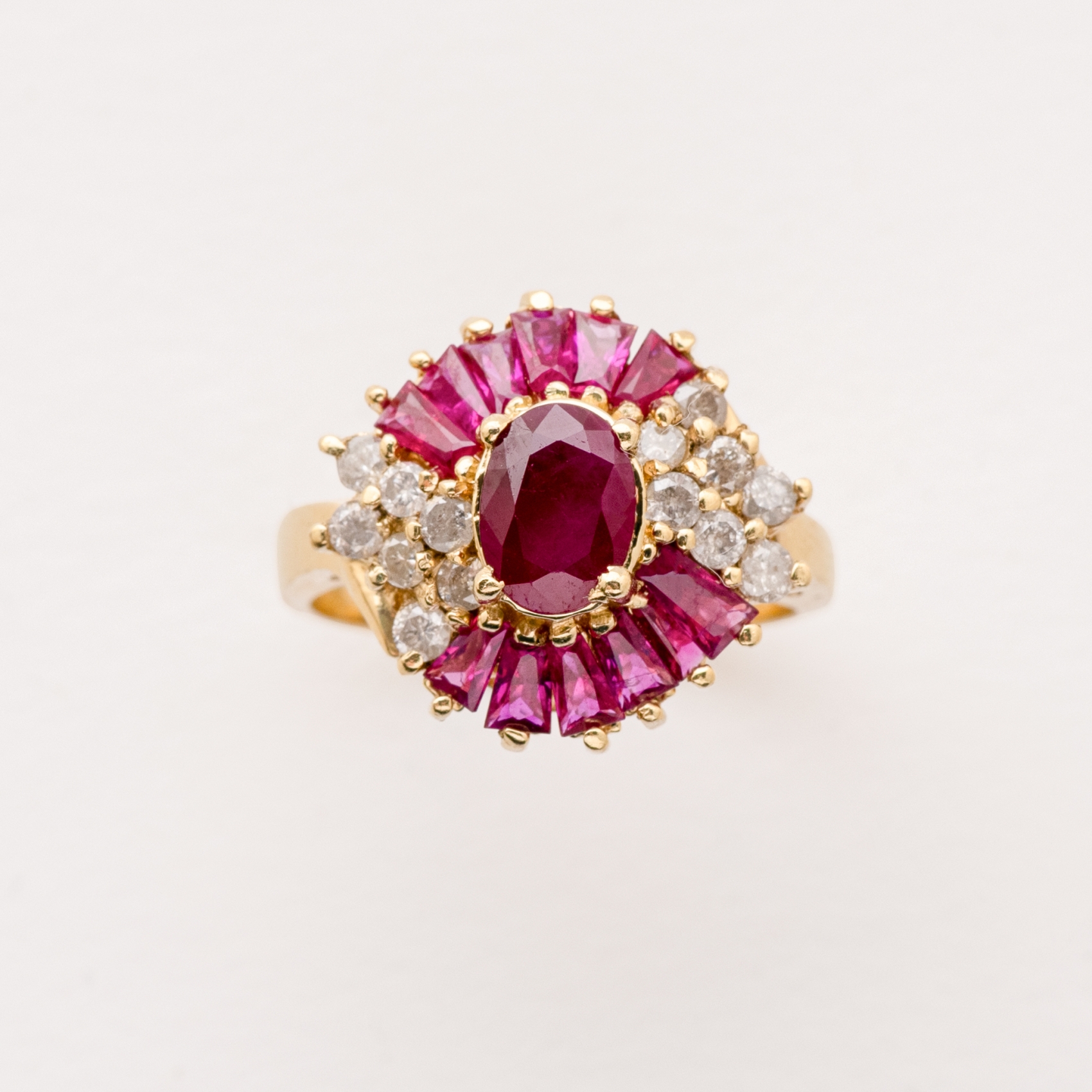 Sortija en oro con diamantes talla brillante y rubíes tallas oval y trapecio.